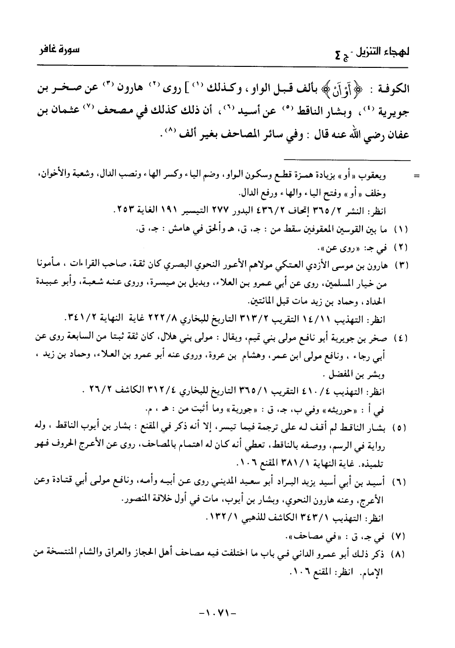 (¬5) بشار الناقط لم أقف له على ترجمة فيما تيسر، إلا أنه ذكر في المقنع: بشار بن أيوب الناقط، وله رواية في الرسم، ووصفه بالناقط، تعطي أنه كان له اهتمام بالمصاحف، روى عن الأعرج الحروف فهو تلميذه. غاية النهاية 1/ 381 المقنع 106.