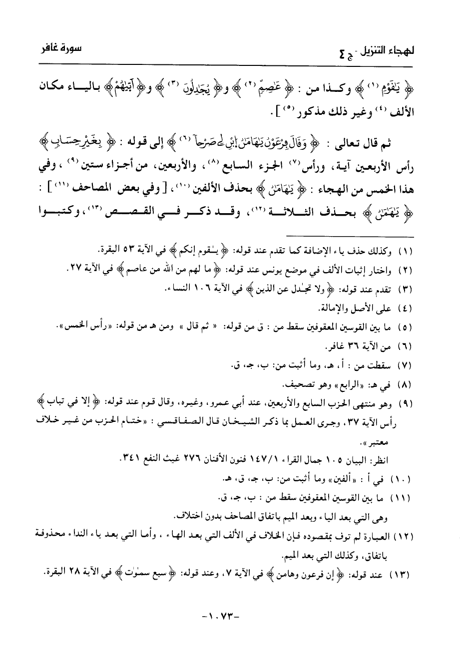 ثم قال تعالى: وقال فرعون يها من ابن لى صرحا (¬6) إلى قوله: بغير حساب رأس الأربعين آية، ورأس (¬7) الجزء السابع (¬8)، والأربعين، من أجزاء ستين (¬9)، وفي هذا الخمس من الهجاء: يهامن بحذف الألفين (¬10)، [وفي بعض المصاحف (¬11)]: