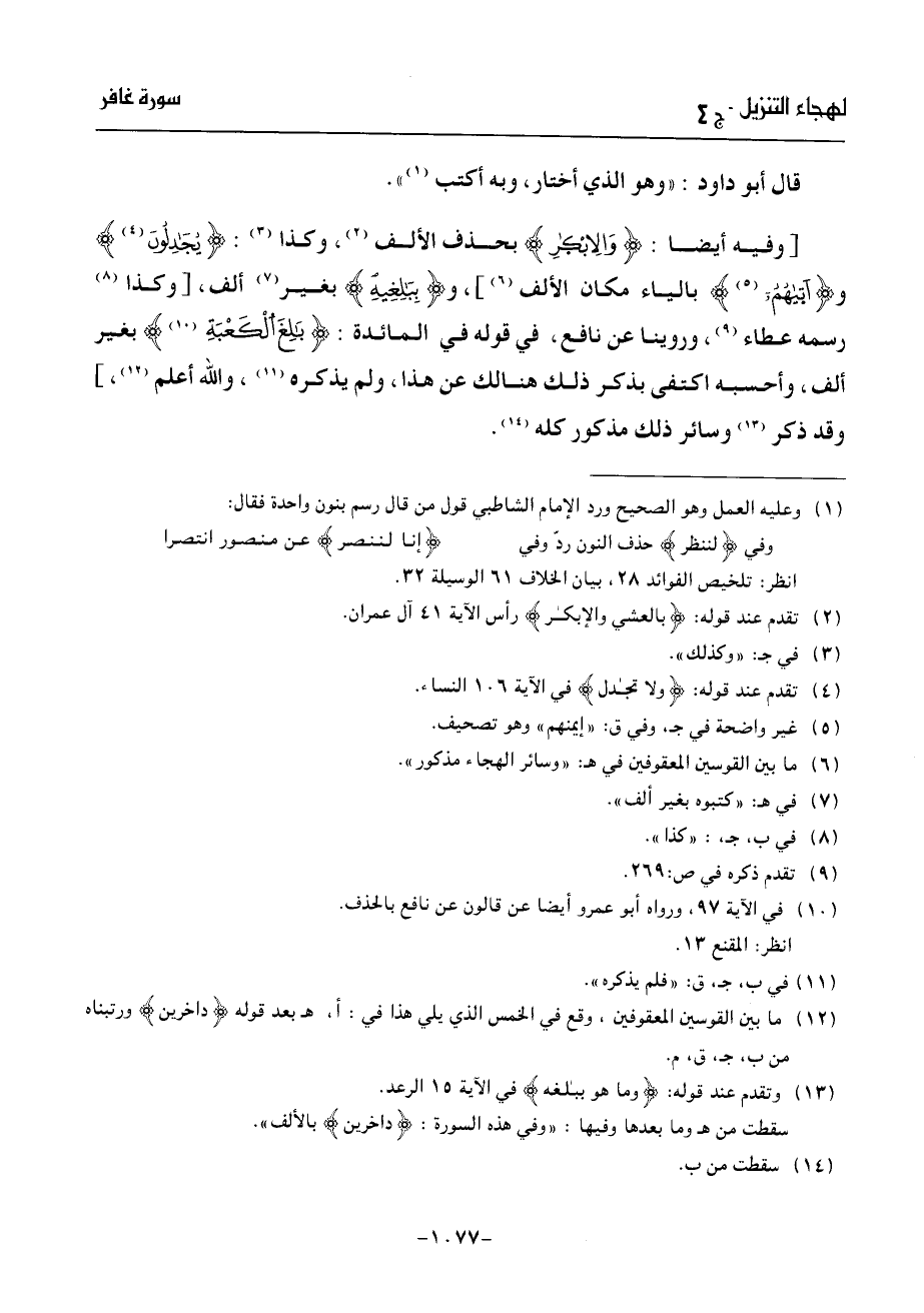 [وفيه أيضا: والابكر بحذف الألف (¬2)، وكذا (¬3): يجدلون (¬4) واتيهم (¬5) بالياء مكان الألف (¬6)]، وببلغيه بغير (¬7) ألف، [وكذا (¬8) رسمه عطاء (¬9)، وروينا عن نافع، في قوله في المائدة: بلغ الكعبة (¬10) بغير ألف، وأحسبه اكتفى بذكر ذلك هنالك عن هذا، ولم يذكره (¬11)، والله أعلم (¬12)،] وقد ذكر (¬13) وسائر ذلك مذكور كله (¬14).