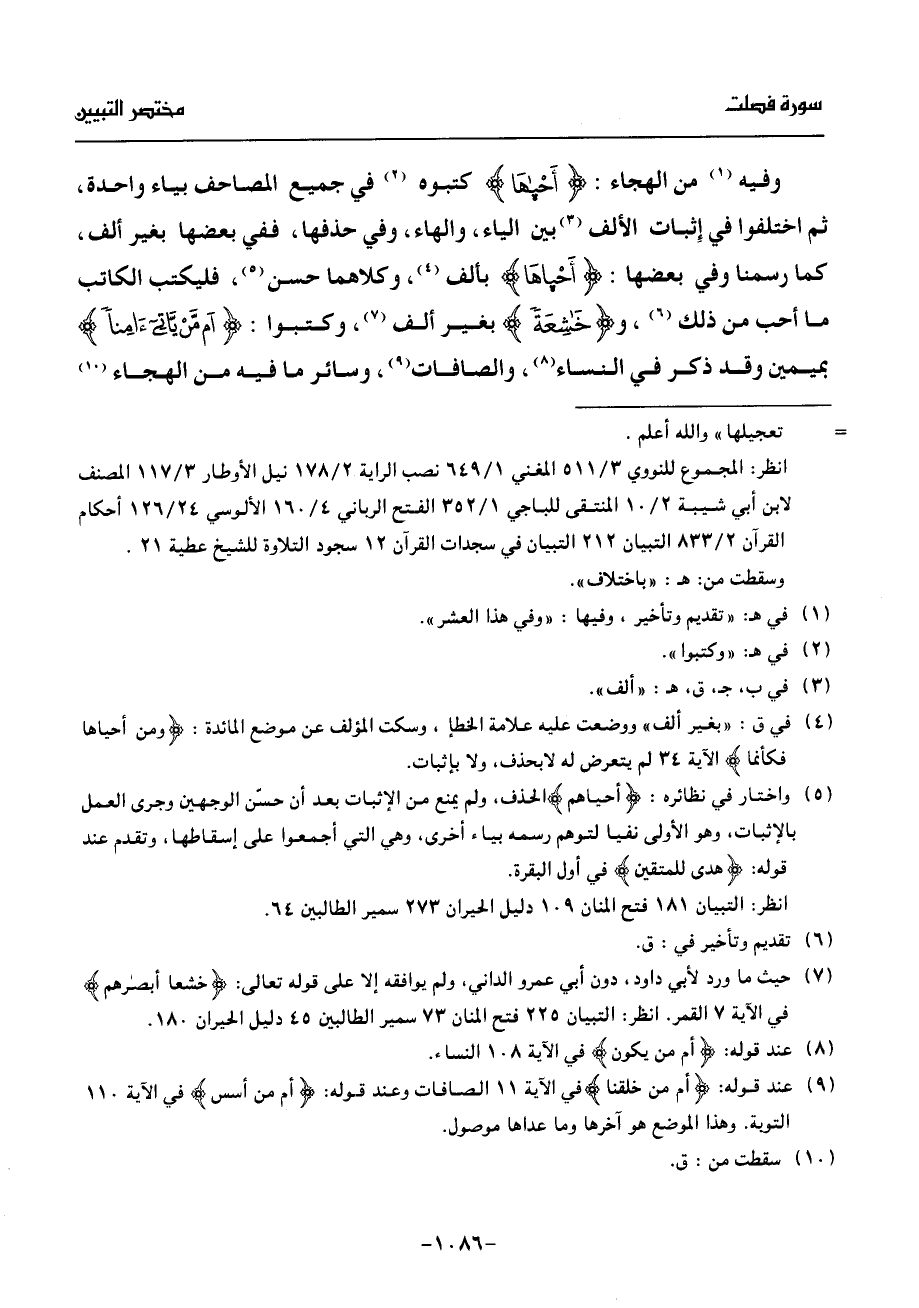 وفيه (¬1) من الهجاء: أحيها كتبوه (¬2) في جميع المصاحف بياء واحدة، ثم اختلفوا في إثبات الألف (¬3) بين الياء، والهاء، وفي حذفها، ففي بعضها بغير ألف، كما رسمنا وفي بعضها: أحياها بألف (¬4)، وكلاهما حسن (¬5)، فليكتب الكاتب ما أحب من ذلك (¬6)، وخشعة بغير ألف (¬7)، وكتبوا: ام مّن يّاتى ءامنا بميمين وقد ذكر في النساء (¬8)، والصافات (¬9)، وسائر ما فيه من الهجاء (¬10)