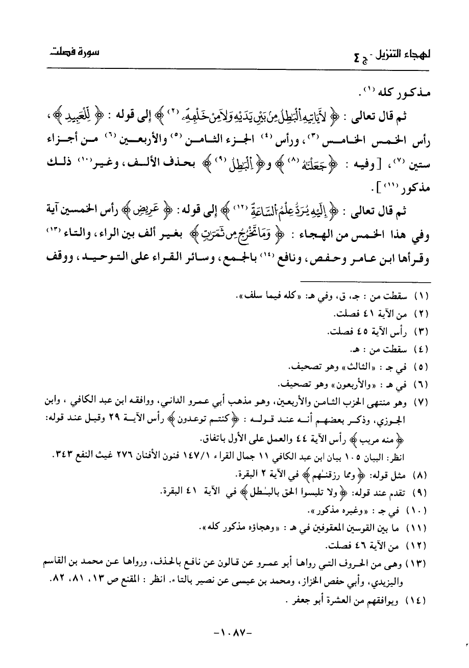 ثم قال تعالى: لّا ياتيه البطل من بين يديه ولا من خلفه (¬2) إلى قوله: لّلعبيد، رأس الخمس الخامس (¬3)، ورأس (¬4) الجزء الثامن (¬5) والأربعين (¬6) من أجزاء ستين (¬7)، [وفيه: جعلنه (¬8) والبطل (¬9) بحذف الألف، وغير (¬10) ذلك مذكور (¬11)].