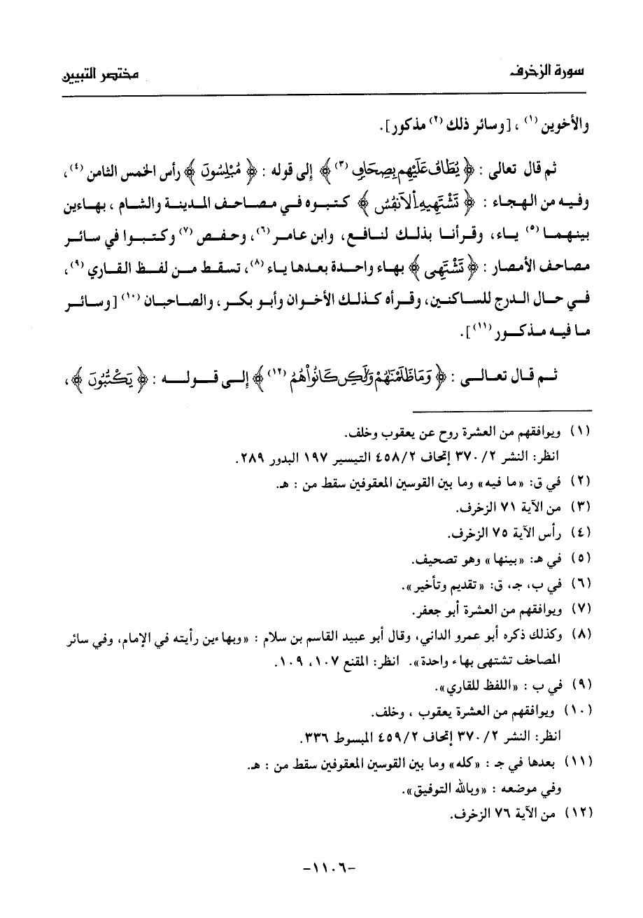 ثم قال تعالى: يطاف عليهم بصحاف (¬3) إلى قوله: مبلسون رأس الخمس الثامن (¬4)، وفيه من الهجاء: تشتهيه الانفس كتبوه في مصاحف المدينة والشام، بهاءين بينهما (¬5) ياء، وقرأنا بذلك لنافع، وابن عامر (¬6)، وحفص (¬7) وكتبوا في سائر مصاحف الأمصار: تشتهى بهاء واحدة بعدها ياء (¬8)، تسقط من لفظ القاري (¬9)، في حال الدرج للساكنين، وقرأه كذلك الأخوان وأبو بكر، والصاحبان (¬10) [وسائر ما فيه مذكور (¬11)].
