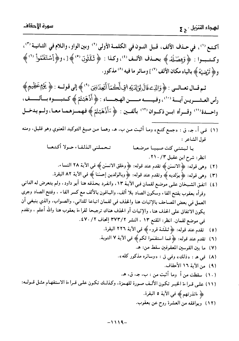 ثم قال تعالى: والذى قال لولديه افّ لّكما أتعدننى (¬9) إلى قوله: يوم عظيم رأس العشرين آية (¬10)، وفيه من الهجاء: أذهبتم كتبوه بألف، واحدة (¬11) وقرأه ابن ذكوان (¬12) بألفين: ء أذهبتم فهمزهما معا، ولم يدخل