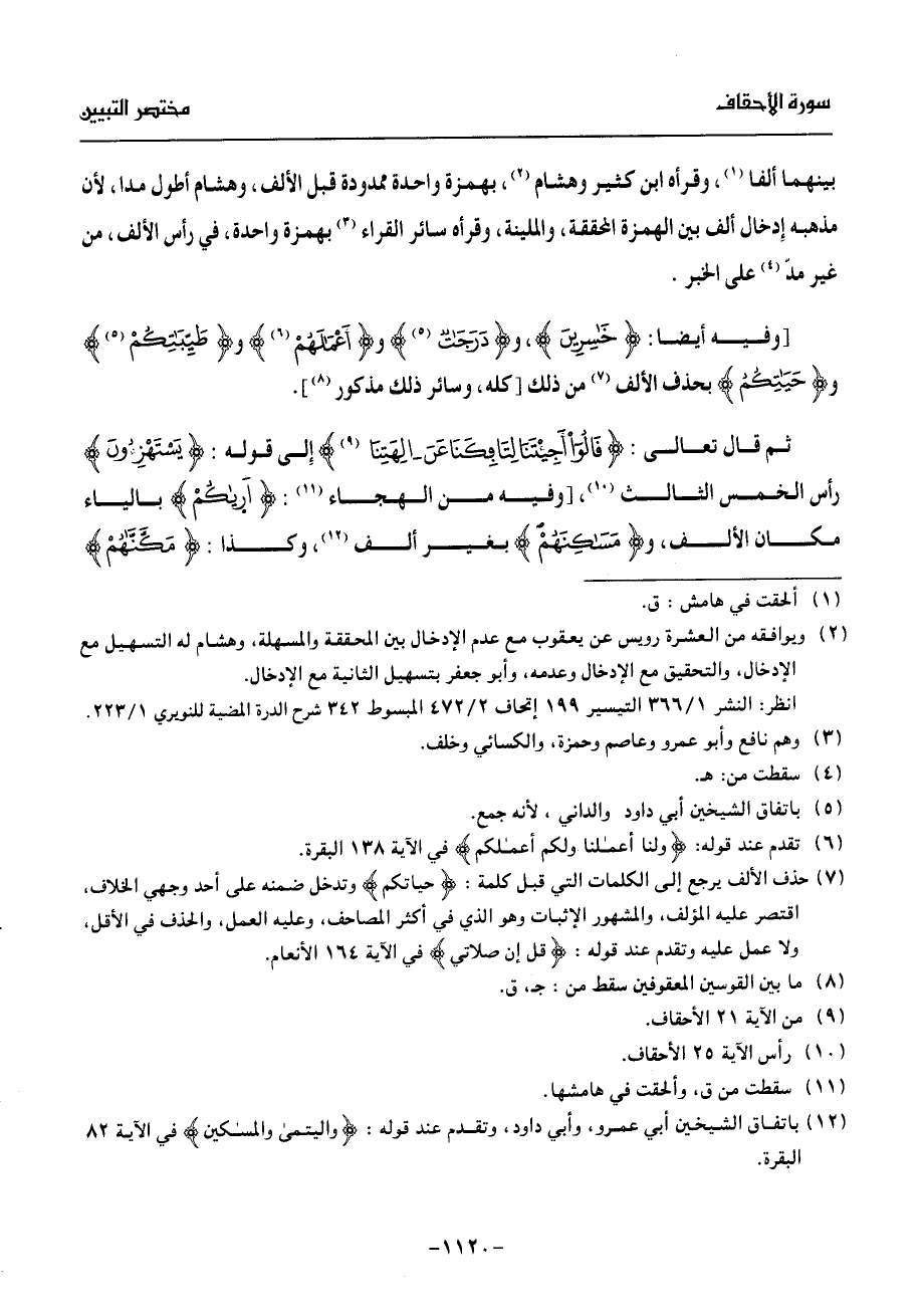 (¬7) حذف الألف يرجع إلى الكلمات التي قبل كلمة: حياتكم وتدخل ضمنه على أحد وجهي الخلاف، اقتصر عليه المؤلف، والمشهور الإثبات وهو الذي في أكثر المصاحف، وعليه العمل، والحذف في الأقل، ولا عمل عليه وتقدم عند قوله: قل إن صلاتي في الآية 164 الأنعام.