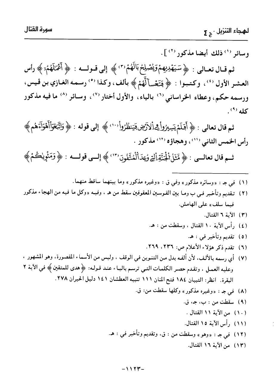 ثم قال تعالى: سيهديهم ويصلح بالهم (¬3) إلى قوله: أعملهم رأس العشر الأول (¬4)، وكتبوا: فتعسا لّهم بألف، وكذا (¬5) رسمه الغازي بن قيس، ورسمه حكم، وعطاء الخراساني (¬6) بالياء، والأول أختار (¬7)، وسائر (¬8) ما فيه مذكور كله (¬9).