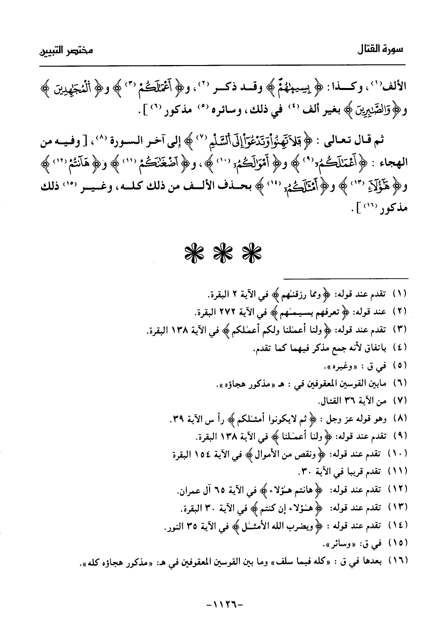 ثم قال تعالى: فلا تهنوا وتدعوا إلى السّلم (¬7) إلى آخر السورة (¬8)، [وفيه من الهجاء: اعملكم (¬9) وأموالكم (¬10)، واضغنكم (¬11) وهانتم (¬12) وهؤلاء (¬13) وأمثلكم (¬14) بحذف الألف من ذلك كله، وغير (¬15) ذلك مذكور (¬16)].