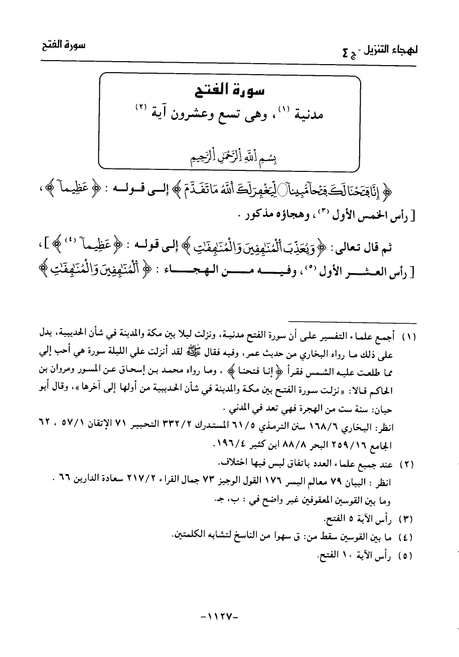 بسم الله الرّحمن الرّحيم إنّا فتحنا لك فتحا مّبينا* لّيغفر لك الله ما تقدّم إلى قوله: عظيما، [رأس الخمس الأول (¬3)، وهجاؤه مذكور.