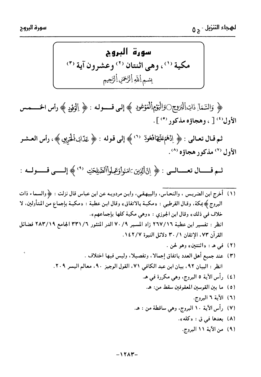 (¬1) أخرج ابن الضريس، والنحاس، والبيهقي، وابن مردويه عن ابن عباس قال نزلت: والسماء ذات البروج بمكة، وقال القرطبي: «مكية بالاتفاق» وقال ابن عطية: «مكية بإجماع من المتأولين، لا خلاف في ذلك» وقال ابن الجوزي: «وهي مكية كلها بإجماعهم».