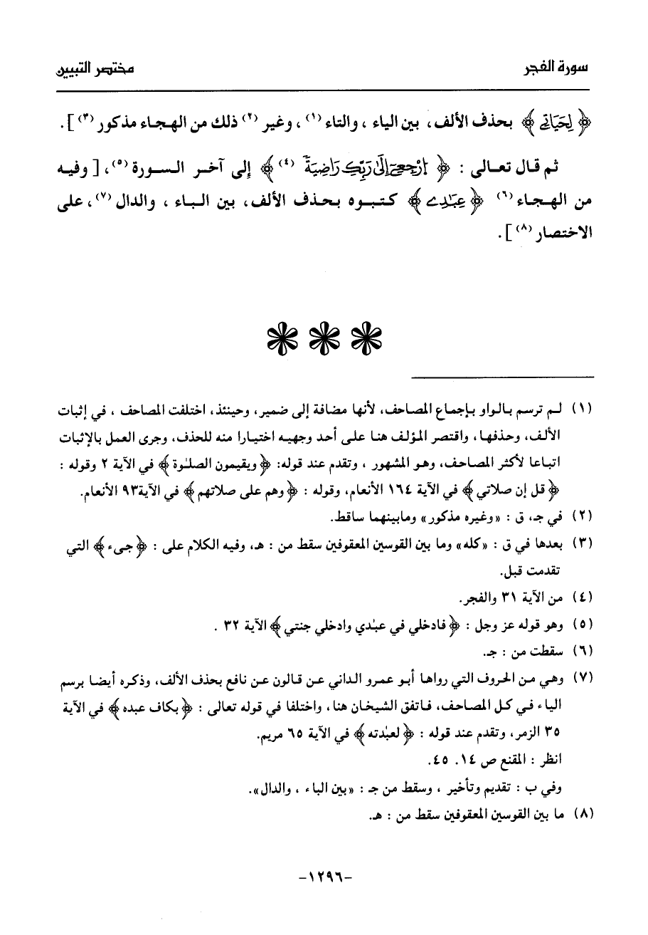 ثم قال تعالى: ارجعى إلى ربّك راضية (¬4) إلى آخر السورة (¬5)، [وفيه من الهجاء (¬6) عبدى كتبوه بحذف الألف، بين الباء، والدال (¬7)، على الاختصار (¬8)].
