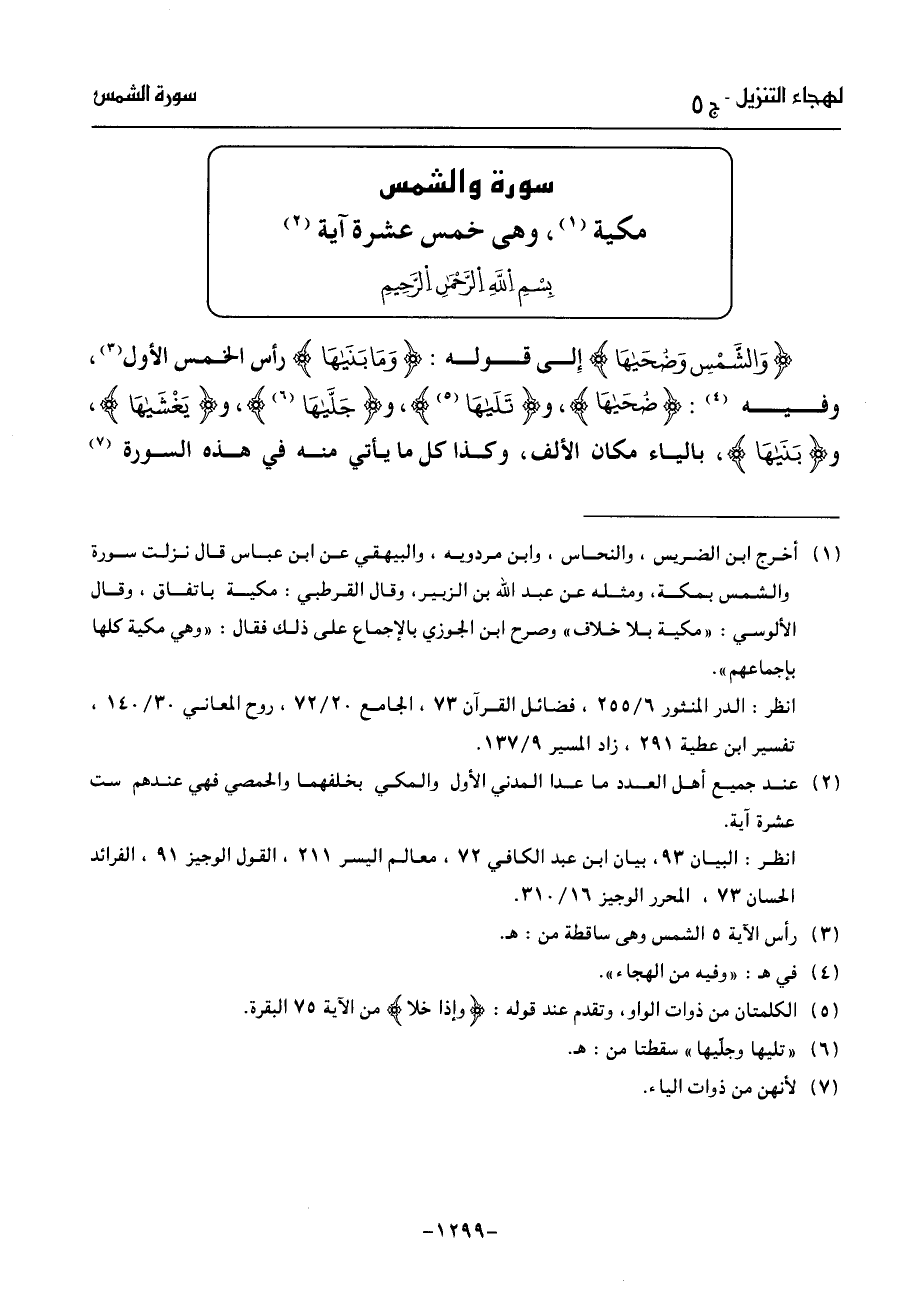 (¬1) أخرج ابن الضريس، والنحاس، وابن مردويه، والبيهقي عن ابن عباس قال نزلت سورة والشمس بمكة، ومثله عن عبد الله بن الزبير، وقال القرطبي: مكية باتفاق، وقال الألوسي: «مكية بلا خلاف» وصرح ابن الجوزي بالإجماع على ذلك فقال: «وهي مكية كلها بإجماعهم».