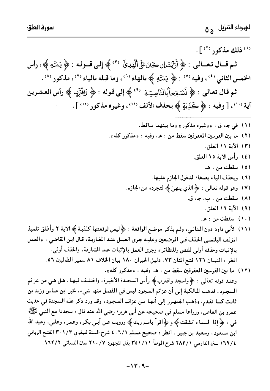 ثم قال تعالى: أريت إن كان على الهدى (¬3) إلى قوله: ينته، رأس الخمس الثاني (¬4)، وفيه (¬5): ينته بالهاء (¬6)، وما قبله بالياء (¬7)، مذكور (¬8).