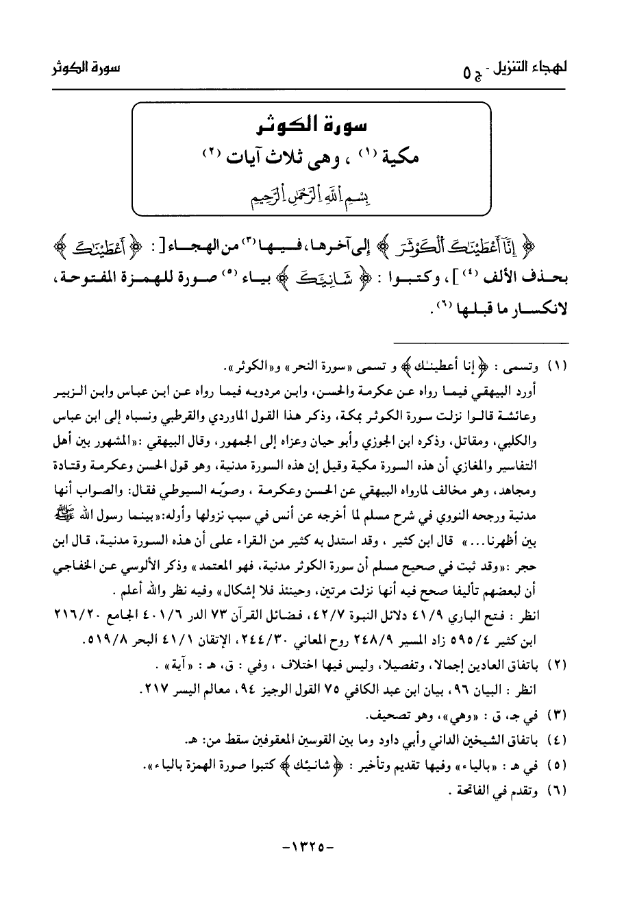 بسم الله الرّحمن الرّحيم إنّآ أعطينك الكوثر إلى آخرها، فيها (¬3) من الهجاء [: أعطينك بحذف الألف (¬4)]، وكتبوا: شانيك بياء (¬5) صورة للهمزة المفتوحة، لانكسار ما قبلها (¬6).