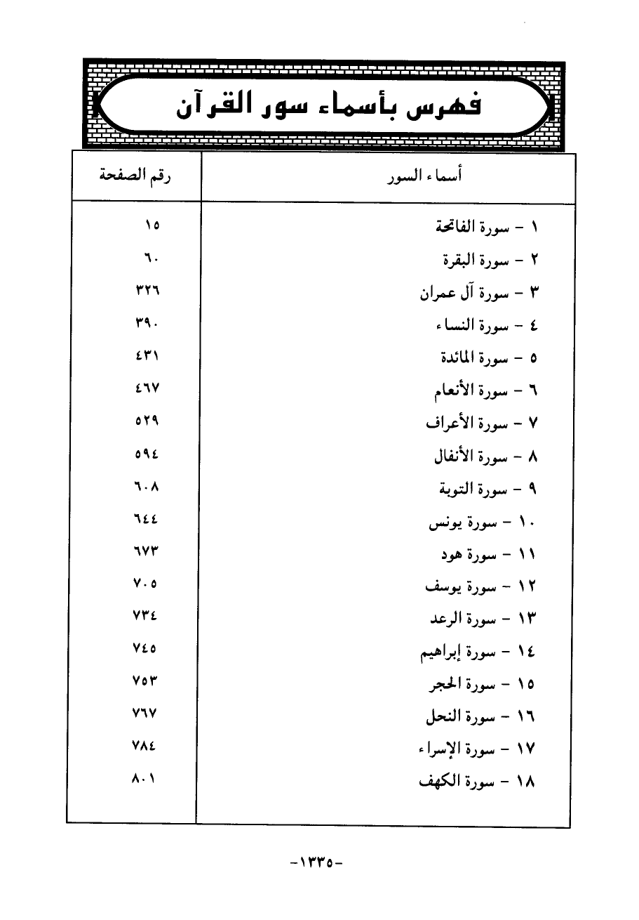 أسماء السور رقم الصفحة 1 - سورة الفاتحة 15 2 - سورة البقرة 60 3 - سورة آل عمران 326 4 - سورة النساء 390 5 - سورة المائدة 431 6 - سورة الأنعام 467 7 - سورة الأعراف 529 8 - سورة الأنفال 594 9 - سورة التوبة 608 10 - سورة يونس 644 11 - سورة هود 673 12 - سورة يوسف 705 13 - سورة الرعد 734 14 - سورة إبراهيم 745 15 - سورة الحجر 753 16 - سورة النحل 767 17 - سورة الإسراء 784 18 - سورة الكهف 801