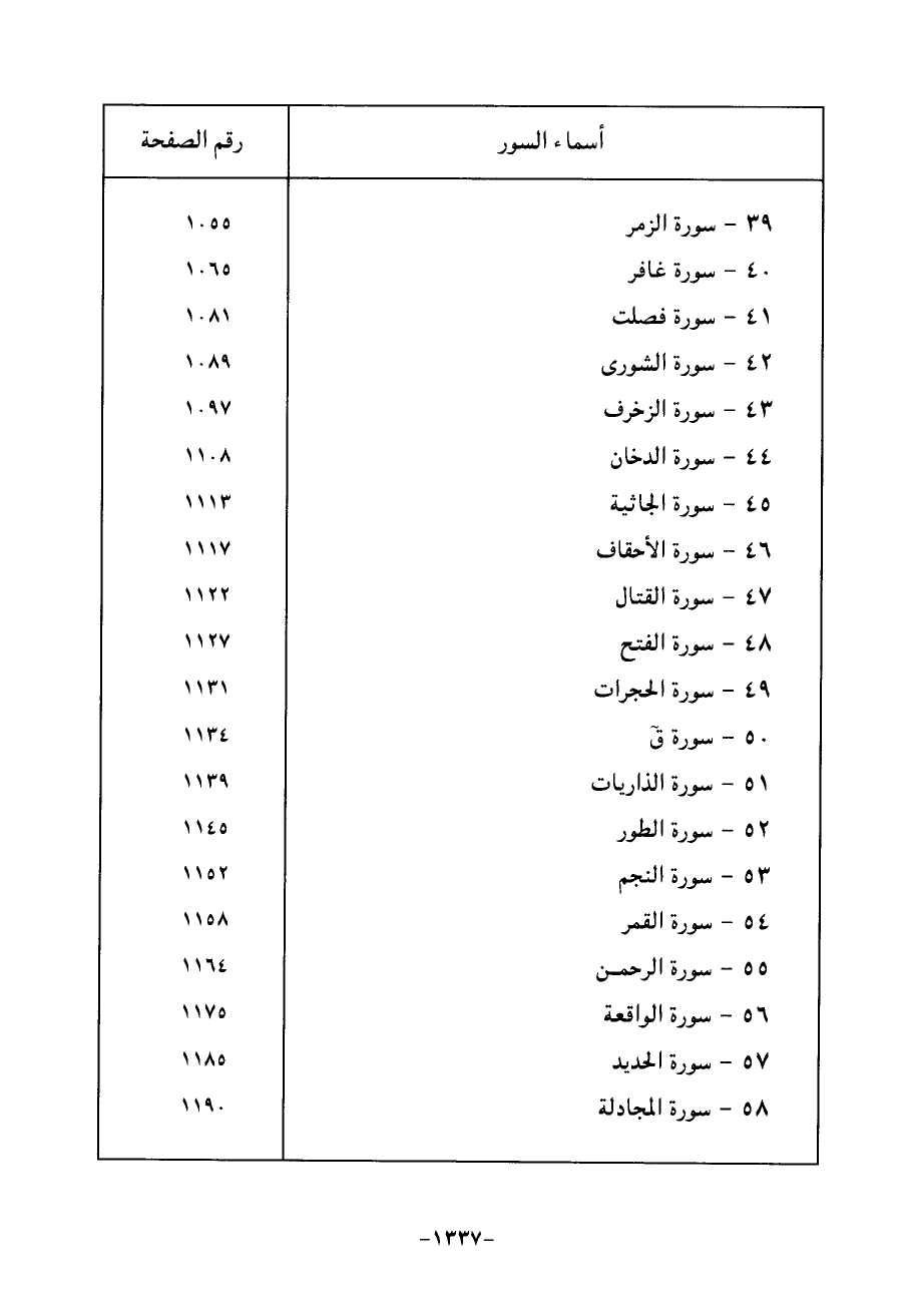 أسماء السور رقم الصفحة 39 - سورة الزمر 1055 40 - سورة غافر 1065 41 - سورة فصلت 1081 42 - سورة الشورى 1089 43 - سورة الزخرف 1097 44 - سورة الدخان 1108 45 - سورة الجاثية 1113 46 - سورة الأحقاف 1117 47 - سورة القتال 1122 48 - سورة الفتح 1127 49 - سورة الحجرات 1131 50 - سورة ق 1134 51 - سورة الذاريات 1139 52 - سورة الطور 1145 53 - سورة النجم 1152 54 - سورة القمر 1158 55 - سورة الرحمن 1164 56 - سورة الواقعة 1175 57 - سورة الحديد 1185 58 - سورة المجادلة 1190