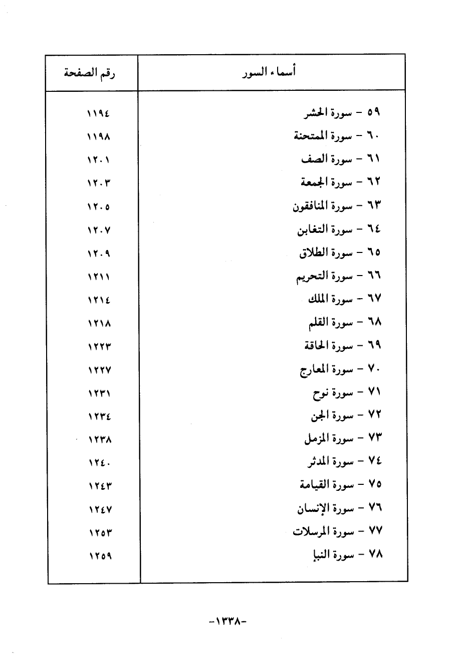 أسماء السور رقم الصفحة 59 - سورة الحشر 1194 60 - سورة الممتحنة 1198 61 - سورة الصف 1201 62 - سورة الجمعة 1203 63 - سورة المنافقون 1205 64 - سورة التغابن 1207 65 - سورة الطلاق 1209 66 - سورة التحريم 1211 67 - سورة الملك 1214 68 - سورة القلم 1218 69 - سورة الحاقة 1223 70 - سورة المعارج 1227 71 - سورة نوح 1231 72 - سورة الجن 1234 73 - سورة المزمل 1238 74 - سورة المدثر 1240 75 - سورة القيامة 1243 76 - سورة الإنسان 1247 77 - سورة المرسلات 1253 78 - سورة النبإ 1259
