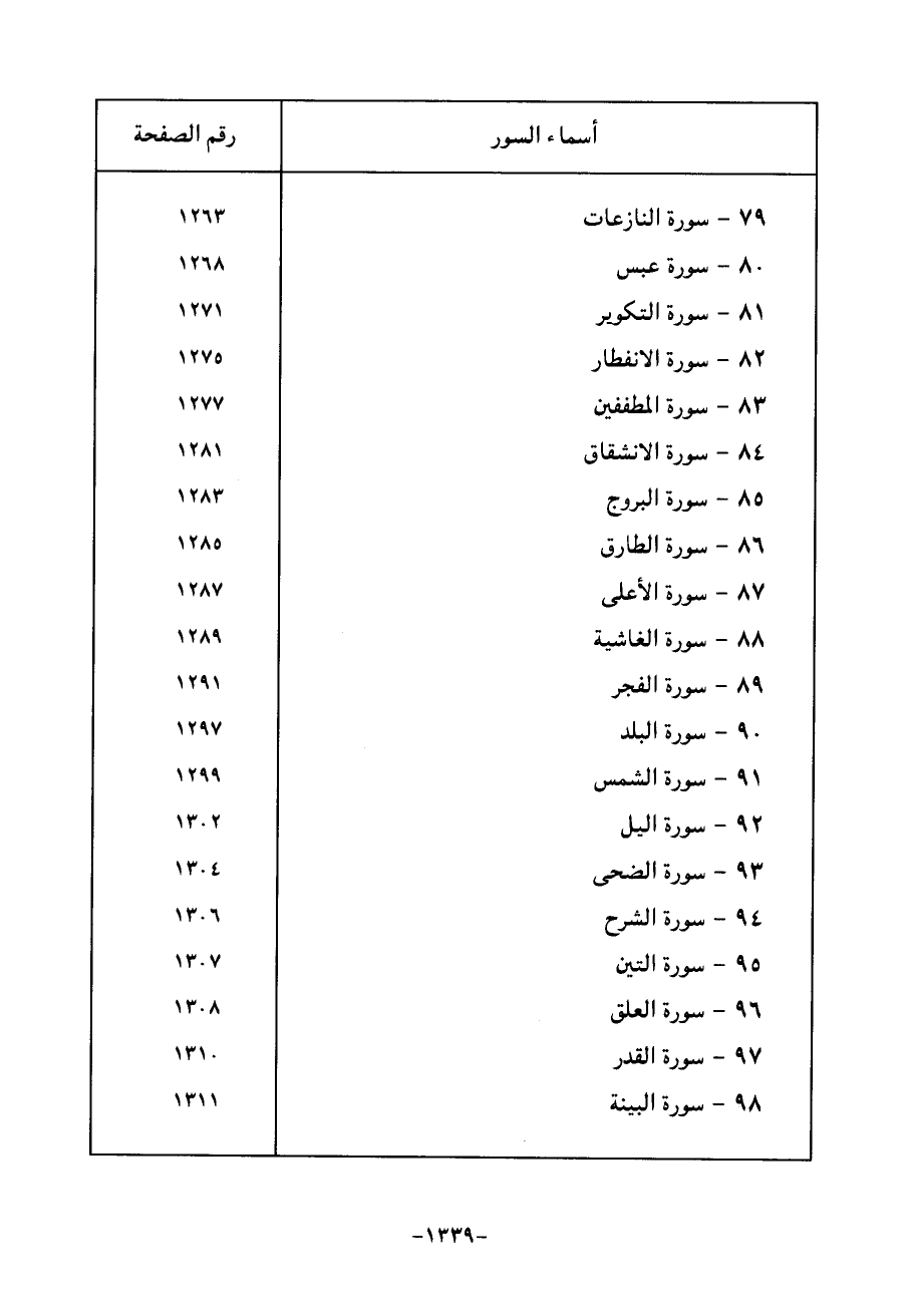 أسماء السور رقم الصفحة 79 - سورة النازعات 1263 80 - سورة عبس 1268 81 - سورة التكوير 1271 82 - سورة الانفطار 1275 83 - سورة المطففين 1277 84 - سورة الانشقاق 1281 85 - سورة البروج 1283 86 - سورة الطارق 1285 87 - سورة الأعلى 1287 88 - سورة الغاشية 1289 89 - سورة الفجر 1291 90 - سورة البلد 1297 91 - سورة الشمس 1299 92 - سورة الليل 1302 93 - سورة الضحى 1304 94 - سورة الشرح 1306 95 - سورة التين 1307 96 - سورة العلق 1308 97 - سورة القدر 1310 98 - سورة البينة 1311