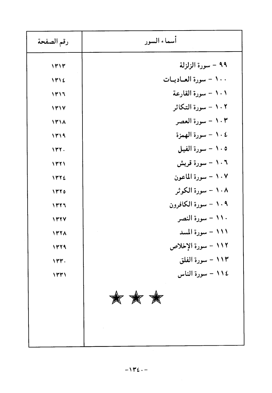 سورة الهمزة 1319 105 - سورة الفيل 1320 106 - سورة قريش 1321 107 - سورة الماعون 1324 108 - سورة الكوثر 1325 109 - سورة الكافرون 1326 110 - سورة النصر 1327 111 - سورة المسد 1328 112 - سورة الإخلاص 1329 113 - سورة الفلق 1330 114 - سورة الناس 1331***