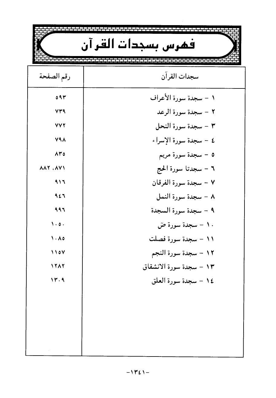سجدات القرآن رقم الصفحة 1 - سجدة سورة الأعراف 593 2 - سجدة سورة الرعد 739 3 - سجدة سورة النحل 772 4 - سجدة سورة الإسراء 798 5 - سجدة سورة مريم 835 6 - سجدتا سورة الحج 871، 882 7 - سجدة سورة الفرقان 916 8 - سجدة سورة النمل 946 9 - سجدة سورة السجدة 996 10 - سجدة سورة ص 1050 11 - سجدة سورة فصلت 1085 12 - سجدة سورة النجم 1157 13 - سجدة سورة الانشقاق 1282 14 - سجدة سورة العلق 1309
