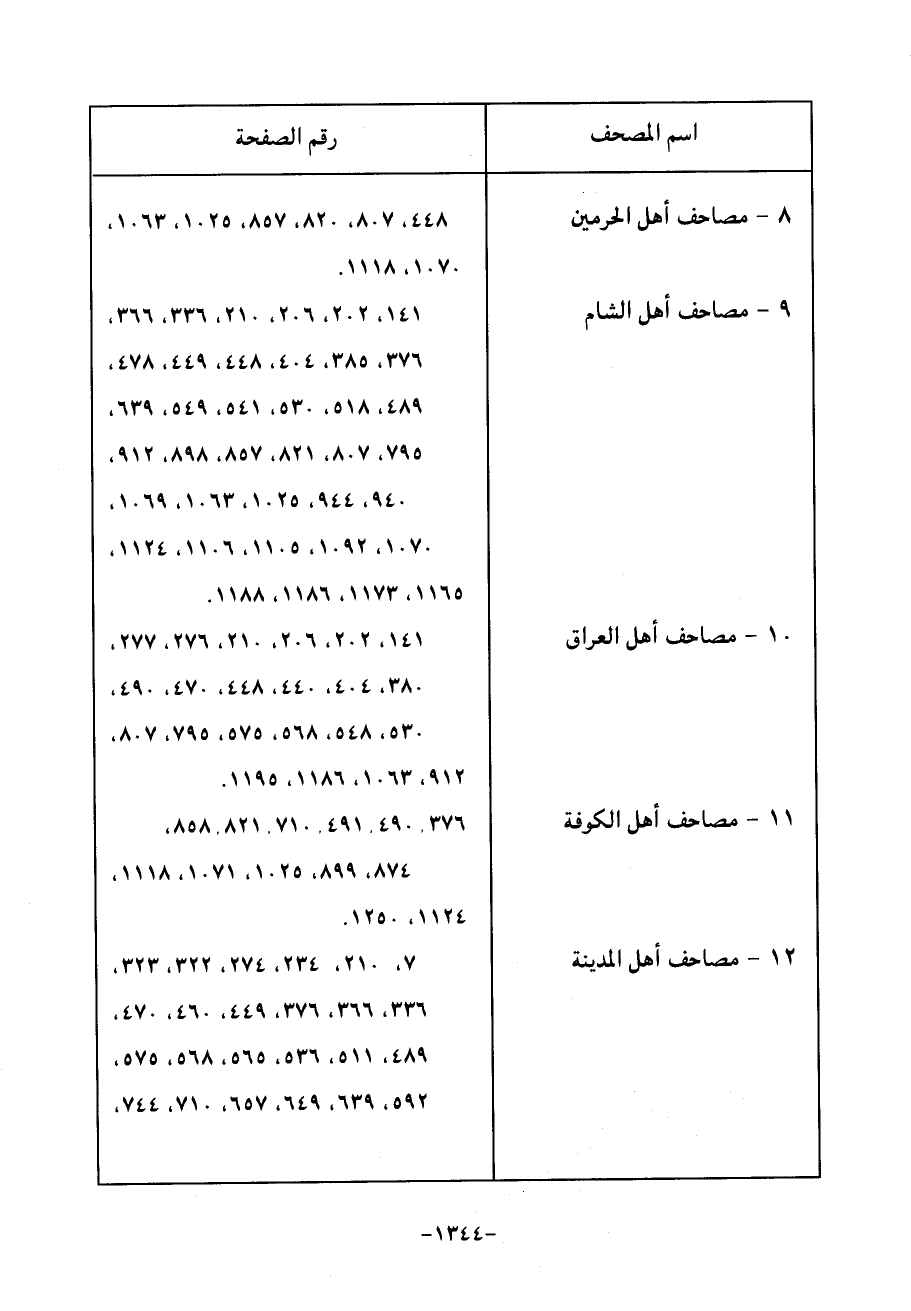 9 - مصاحف أهل الشام 141، 202، 206، 210، 336، 366، 376، 385، 404، 448، 449، 478، 489، 518، 530، 541، 549، 639، 795، 807، 821، 857، 898، 912، 940، 944، 1025، 1063، 1069، 1070، 1092، 1105، 1106، 1124، 1165، 1173، 1186، 1188.