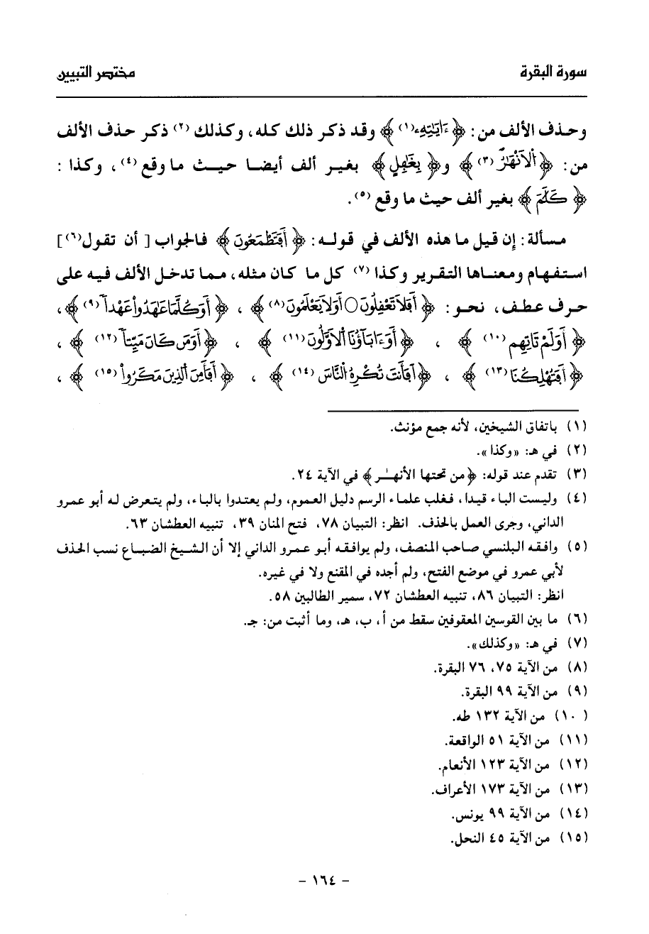(¬4) وليست الباء قيدا، فغلب علماء الرسم دليل العموم، ولم يعتدوا بالباء، ولم يتعرض له أبو عمرو الداني، وجرى العمل بالحذف. انظر: التبيان 78، فتح المنان 39، تنبيه العطشان 63.