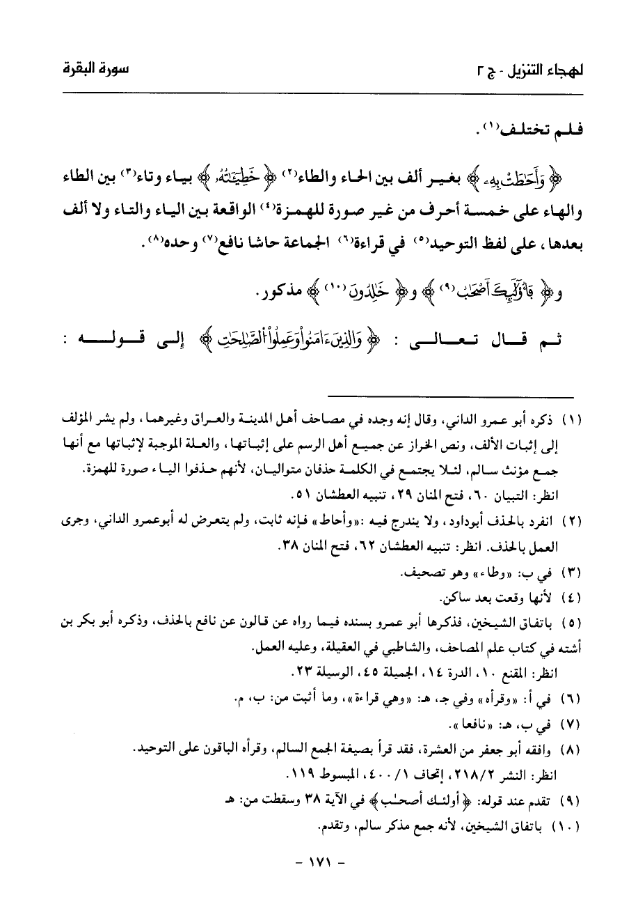 (¬1) ذكره أبو عمرو الداني، وقال إنه وجده في مصاحف أهل المدينة والعراق وغيرهما، ولم يشر المؤلف إلى إثبات الألف، ونص الخراز عن جميع أهل الرسم على إثباتها، والعلة الموجبة لإثباتها مع أنها جمع مؤنث سالم، لئلا يجتمع في الكلمة حذفان متواليان، لأنهم حذفوا الياء صورة للهمزة.