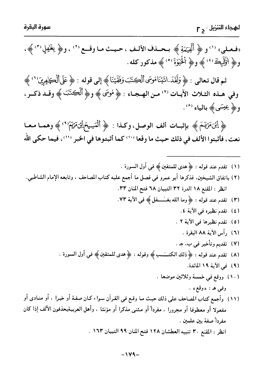 (¬11) وأجمع كتاب المصاحف على ذلك حيث ما وقع في القرآن سواء كان صفة أو خبرا، أو منادى أو مفعولا أو معطوفا أو مجرورا، مفردا أو مثنى مذكرا أو مؤنثا، وأهل العربية يحذفون الألف إذا كان مفردا صفة بين علمين.