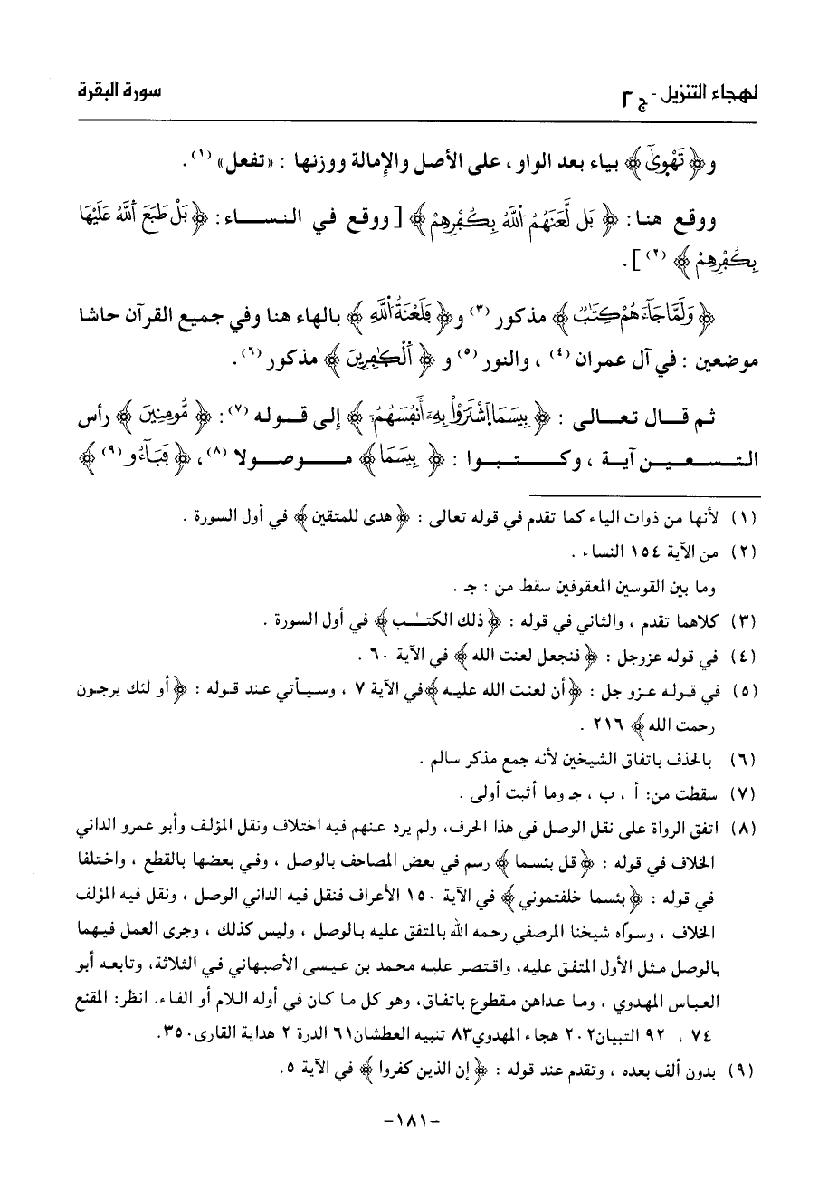 ولمّا جاءهم كتب مذكور (¬3) وفلعنة الله بالهاء هنا وفي جميع القرآن حاشا موضعين: في آل عمران (¬4)، والنور (¬5) والكفرين مذكور (¬6).