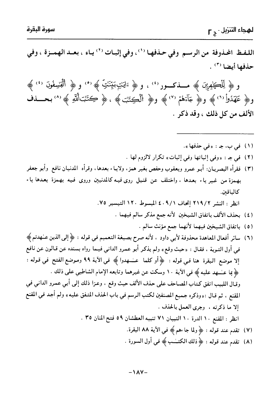 (¬6) سائر أفعال المعاهدة محذوفة لأبي داود، لأنه صرح بصيغة التعميم في قوله: إلى الذين عهدتم في أول التوبة، فقال: «حيث وقع» ولم يذكر أبو عمرو الداني فيما رواه بسنده عن قالون عن نافع إلا موضع البقرة هنا في قوله: أو كلما عهدوا في الآية 99 وموضع الفتح في قوله: