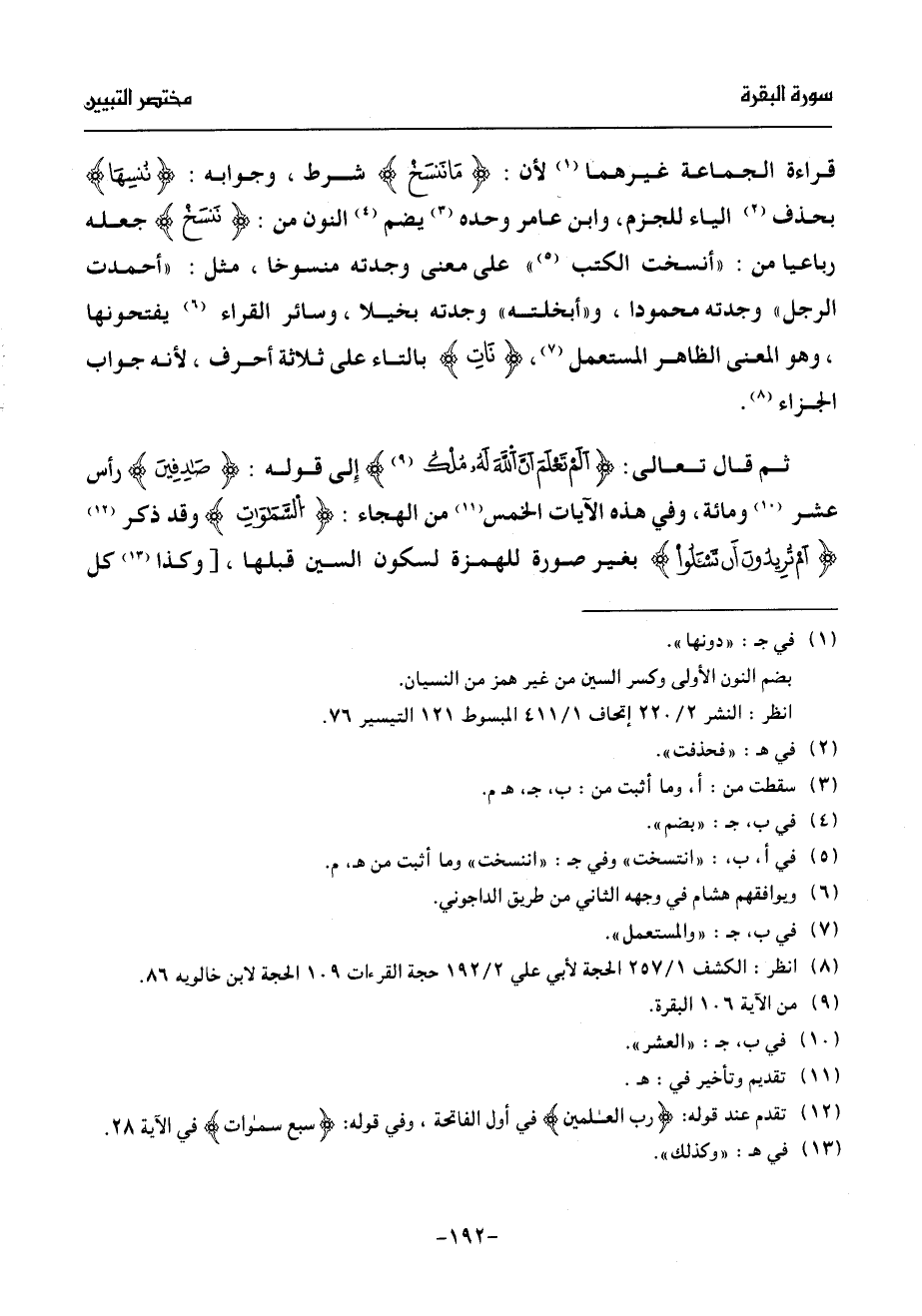 قراءة الجماعة غيرهما (¬1) لأن: ما ننسخ شرط، وجوابه: ننسها بحذف (¬2) الياء للجزم، وابن عامر وحده (¬3) يضم (¬4) النون من: ننسخ جعله رباعيا من: «أنسخت الكتب» (¬5) على معنى وجدته منسوخا، مثل: «أحمدت الرجل» وجدته محمودا، و «أبخلته» وجدته بخيلا، وسائر القراء (¬6) يفتحونها، وهو المعنى الظاهر المستعمل (¬7)، نات بالتاء على ثلاثة أحرف، لأنه جواب الجزاء (¬8).
