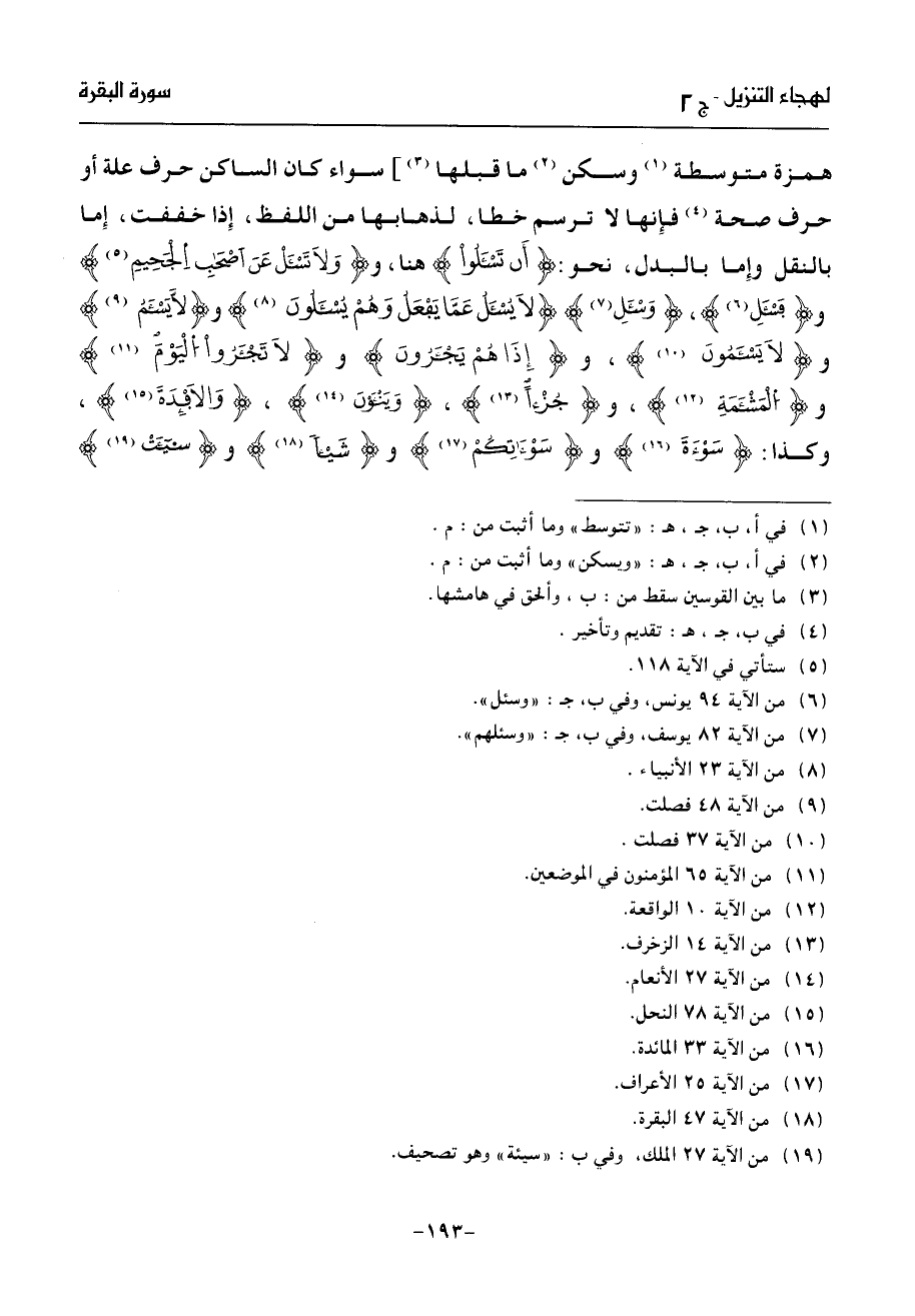 همزة متوسطة (¬1) وسكن (¬2) ما قبلها (¬3)] سواء كان الساكن حرف علة أو حرف صحة (¬4) فإنها لا ترسم خطا، لذهابها من اللفظ، إذا خففت، إما بالنقل وإما بالبدل، نحو: أن تسئلوا هنا، وو لا تسئل عن اصحب الجحيم (¬5) وفسئل (¬6)، وسئل (¬7) لا سئل عمّا يفعل وهم يسئلون (¬8) ولأيسئم (¬9) ولا يسئمون (¬10)، وإذا هم يجئرون ولا تجئروا اليوم (¬11) والمشئمة (¬12)، وجزءا (¬13)، وينئون (¬14)، والافئدة (¬15)، وكذا: سوءة (¬16) وسوءتكم (¬17) وشيئا (¬18) وسيئت (¬19)
