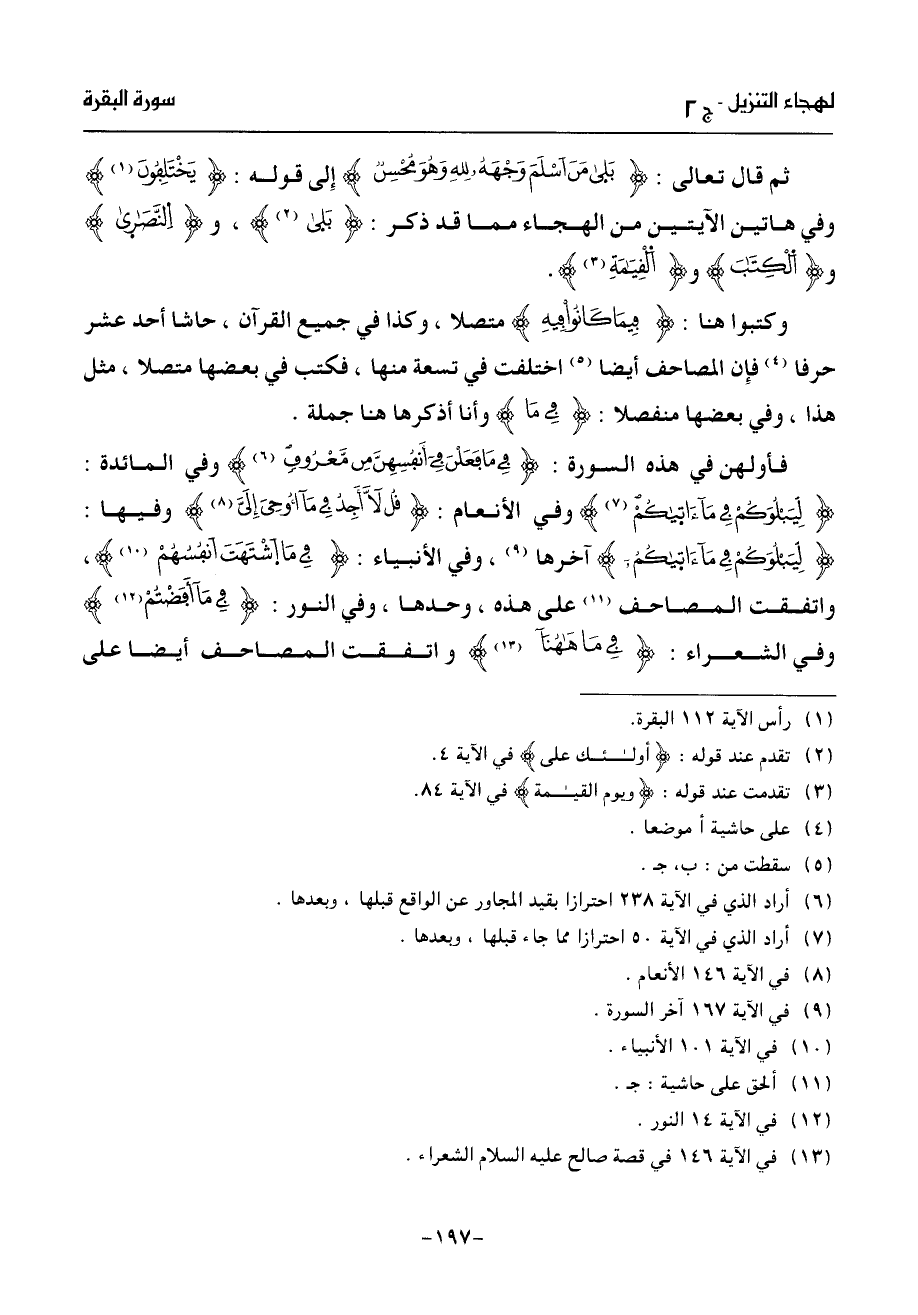 ثم قال تعالى: بلى من اسلم وجهه لله وهو محسن إلى قوله: يختلفون (¬1) وفي هاتين الآيتين من الهجاء مما قد ذكر: بلى (¬2)، والنّصرى والكتب والقيمة (¬3).