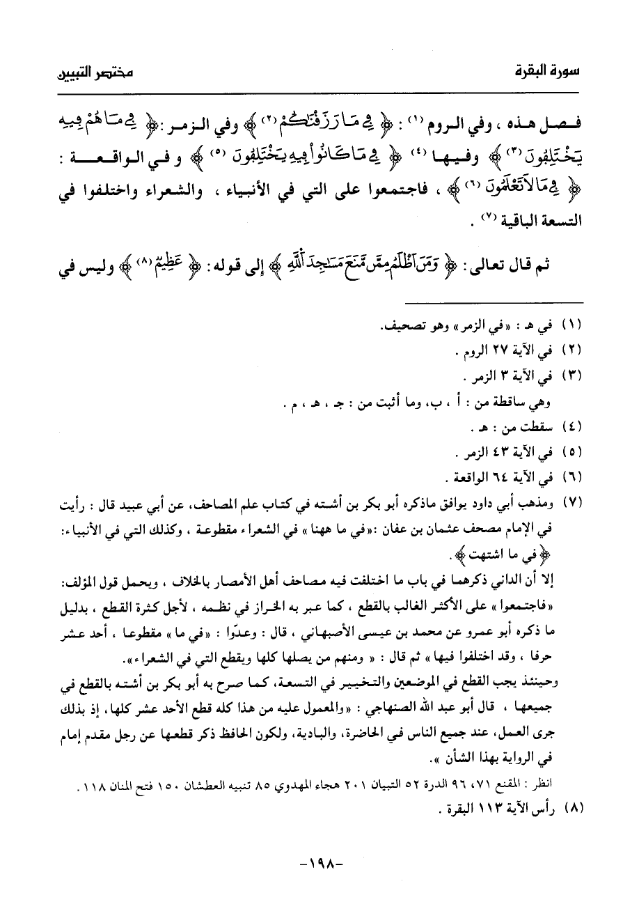 (¬7) ومذهب أبي داود يوافق ما ذكره أبو بكر بن أشتة في كتاب علم المصاحف، عن أبي عبيد قال: رأيت في الإمام مصحف عثمان بن عفان: «في ما هاهنا» في الشعراء مقطوعة، وكذلك التي في الأنبياء: