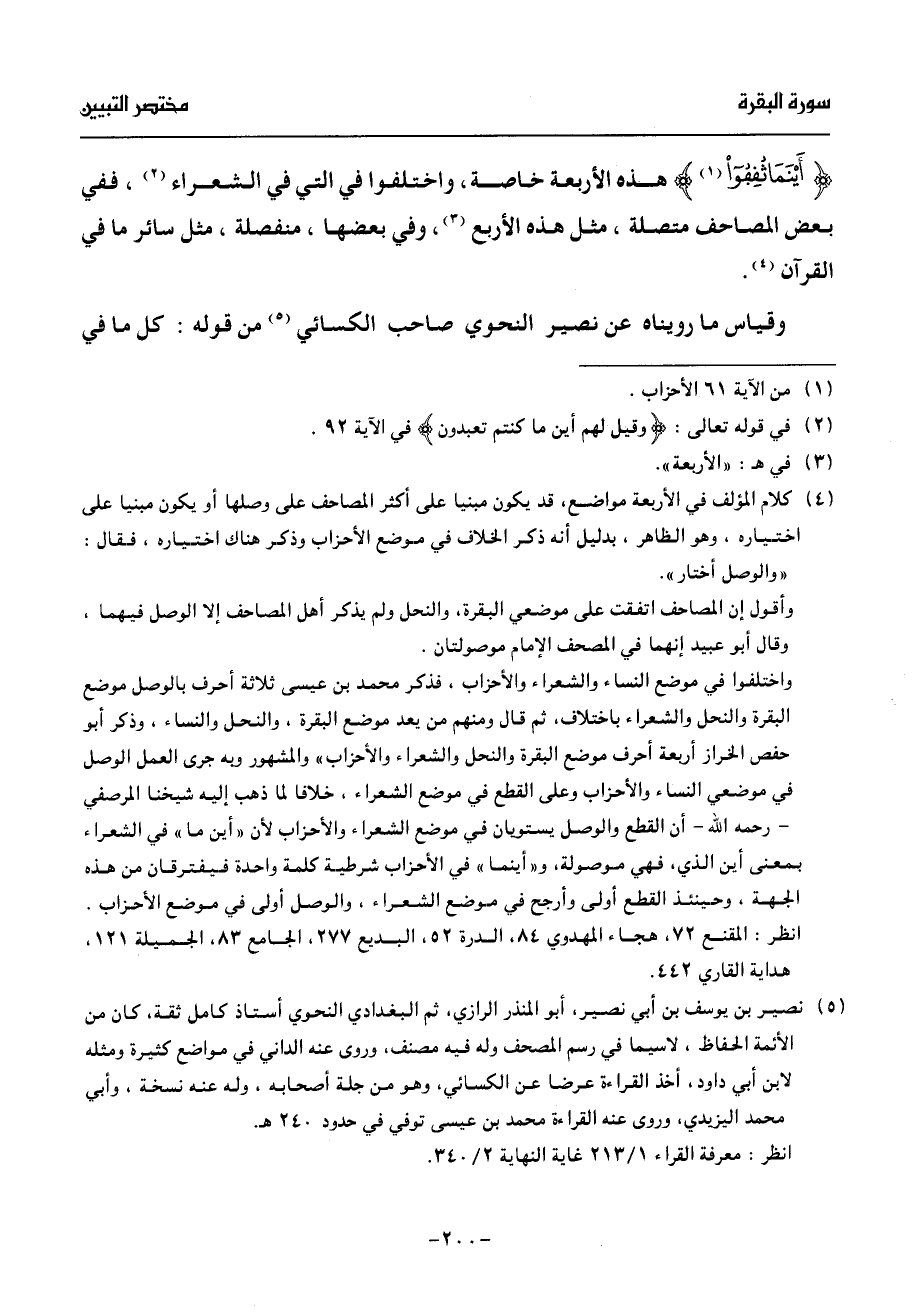 واختلفوا في موضع النساء والشعراء والأحزاب، فذكر محمد بن عيسى ثلاثة أحرف بالوصل موضع البقرة والنحل والشعراء باختلاف، ثم قال ومنهم من يعد موضع البقرة، والنحل والنساء، وذكر أبو حفص الخراز أربعة أحرف موضع البقرة والنحل والشعراء والأحزاب» والمشهور وبه جرى العمل الوصل في موضعي النساء والأحزاب وعلى القطع في موضع الشعراء، خلافا لما ذهب إليه شيخنا المرصفي- رحمه الله- أن القطع والوصل يستويان في موضع الشعراء والأحزاب لأن «أين ما» في الشعراء بمعنى أين الذي، فهي موصولة، و «أينما» في الأحزاب شرطية كلمة واحدة فيفترقان من هذه الجهة، وحينئذ القطع أولى وأرجح في موضع الشعراء، والوصل أولى في موضع الأحزاب.