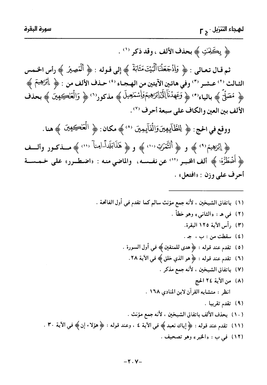 ثم قال تعالى: وإذ جعلنا البيت مثابة إلى قوله: المصير رأس الخمس الثالث (¬2) عشر (¬3) وفي هاتين الآيتين من الهجاء (¬4) حذف الألف من: إبرهيم مصلّى بالياء (¬5) وعهدنا إلى إبرهيم وإسمعيل مذكور (¬6) والعكفين بحذف الألف بين العين والكاف على سبعة أحرف (¬7).