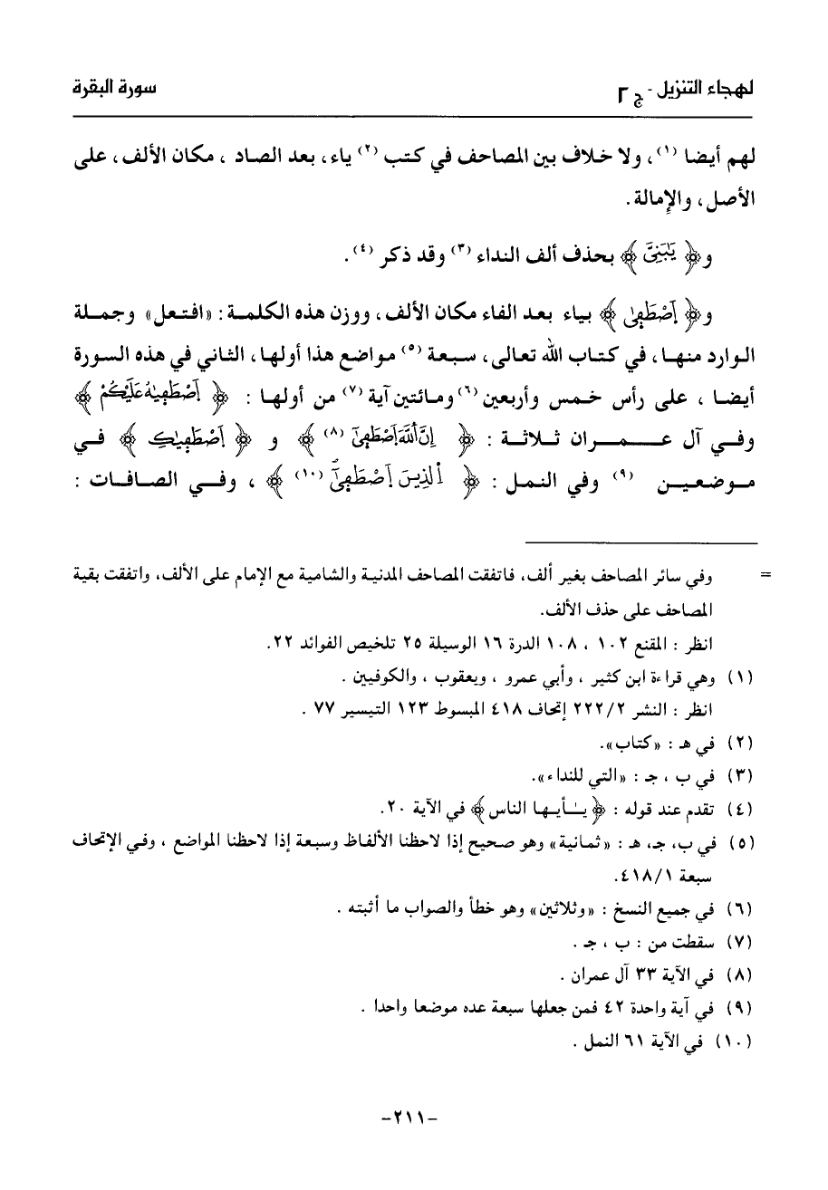 واصطفى بياء بعد الفاء مكان الألف، ووزن هذه الكلمة: «افتعل» وجملة الوارد منها، في كتاب الله تعالى، سبعة (¬5) مواضع هذا أولها، الثاني في هذه السورة أيضا، على رأس خمس وأربعين (¬6) ومائتين آية (¬7) من أولها: اصطفيه عليكم وفي آل عمران ثلاثة: إنّ الله اصطفى (¬8) واصطفيك في موضعين (¬9) وفي النمل: الذين اصطفى (¬10)، وفي الصافات:
