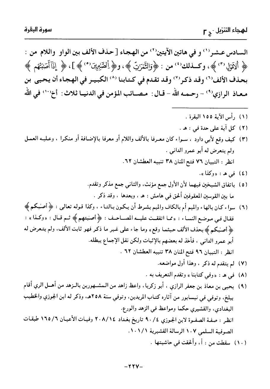الاموال (¬3)، وكذلك (¬4) من: والثّمرات، والصّبرين (¬5)]، إذا أصبتهم بحذف الألف (¬6) وقد ذكر (¬7) وقد تقدم في كتابنا (¬8) الكبير في الهجاء أن يحيى بن معاذ الرازي (¬9) - رحمه الله- قال: مصائب المؤمن في الدنيا ثلاث: أخ (¬10) في الله