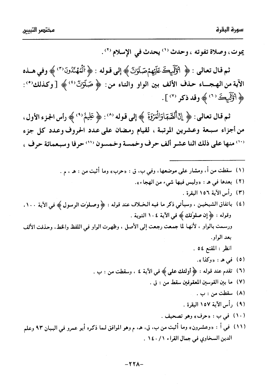 ثم قال تعالى: أولئك عليهم صلوت إلى قوله: المهتدون (¬3) وفي هذه الآية من الهجاء حذف الألف بين الواو والتاء من: صلوت (¬4) [وكذلك (¬5):