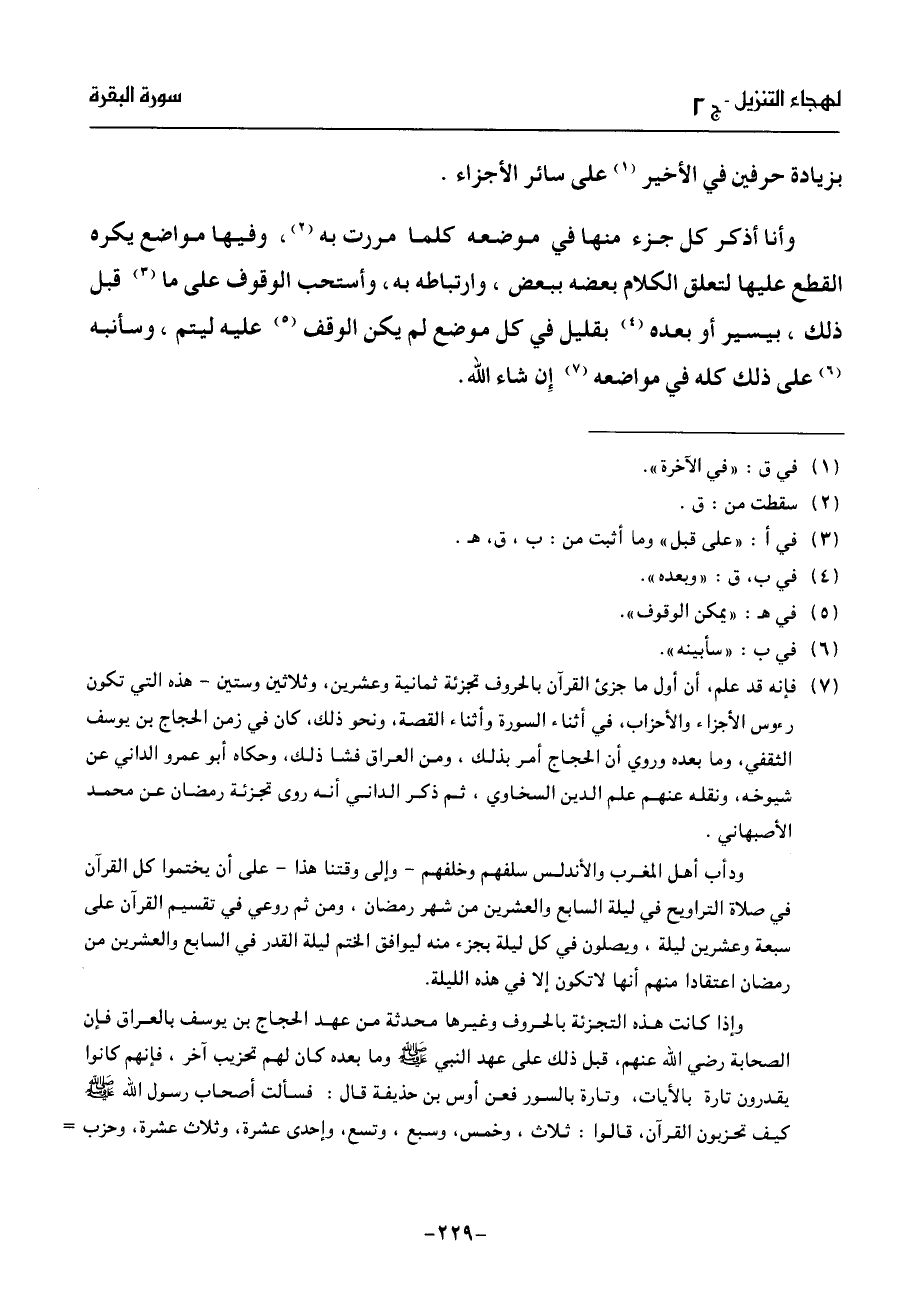 (¬7) فإنه قد علم، أن أول ما جزئ القرآن بالحروف تجزئة ثمانية وعشرين، وثلاثين وستين- هذه التي تكون رءوس الأجزاء والأحزاب، في أثناء السورة وأثناء القصة، ونحو ذلك، كان في زمن الحجاج بن يوسف الثقفي، وما بعده وروي أن الحجاج أمر بذلك، ومن العراق فشا ذلك، وحكاه أبو عمرو الداني عن شيوخه، ونقله عنهم علم الدين السخاوي، ثم ذكر الداني أنه روى تجزئة رمضان عن محمد الأصبهاني.