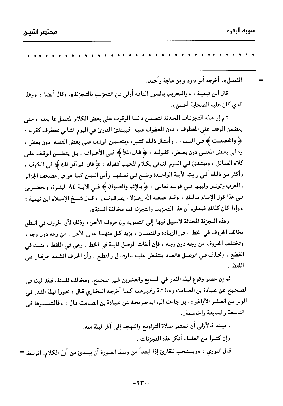 والمحصنت في النساء، وأمثال ذلك كثير، ويتضمن الوقف على بعض القصة دون بعض، وعلى بعض المعنى دون بعض، كقوله: قال الملأ في الأعراف، بل يتضمن الوقف على كلام السائل، ويبتدئ في اليوم الثاني بكلام المجيب كقوله: قال ألم أقل لك في الكهف، وأكثر من ذلك أني رأيت الآية الواحدة وضع في نصفها رأس الثمن كما هو في مصحف الجزائر والمغرب وتونس وليبيا في قوله تعالى: بالإثم والعدوان في الآية 84 البقرة، ويحضرني في هذا قول الإمام مالك: «قد جمعه الله وهؤلاء يفرقونه»، قال شيخ الإسلام ابن تيمية:
