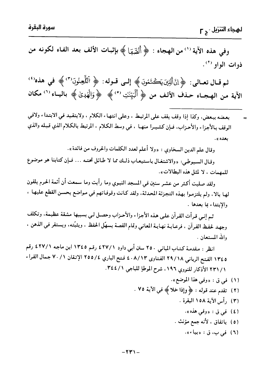 ثم قال تعالى: انّ الذين يكتمون إلى قوله: اللّعنون (¬3) في هذه (¬4) الآية من الهجاء حذف الألف من البيّنت (¬5) والهدى بالياء (¬6) مكان