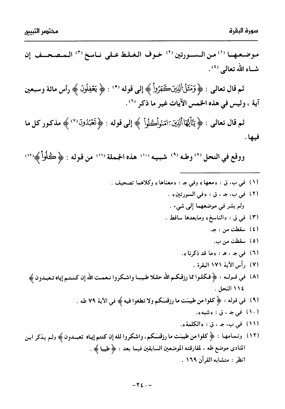 (¬12) وتمامها: كلوا من طيبت ما رزقنكم، واشكروا لله إن كنتم إياه تعبدون ولم يذكر ابن المنادى موضع طه، لمفارقته الموضعين السابقين فيما بعد: طيبا.