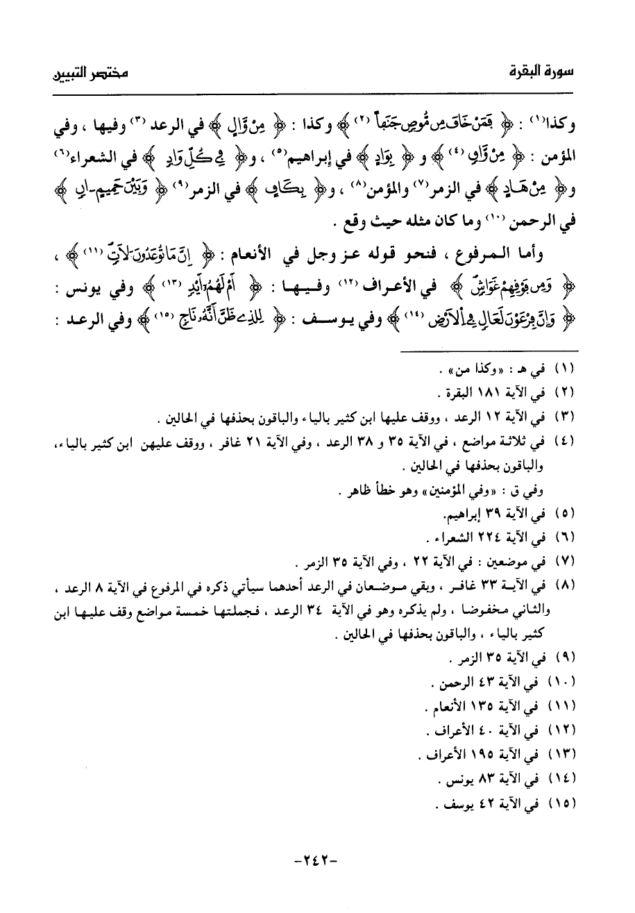 (¬8) في الآية 33 غافر، وبقي موضعان في الرعد أحدهما سيأتي ذكره في المرفوع في الآية 8 الرعد، والثاني مخفوضا، ولم يذكره وهو في الآية 34 الرعد، فجملتها خمسة مواضع وقف عليها ابن كثير بالياء، والباقون بحذفها في الحالين.