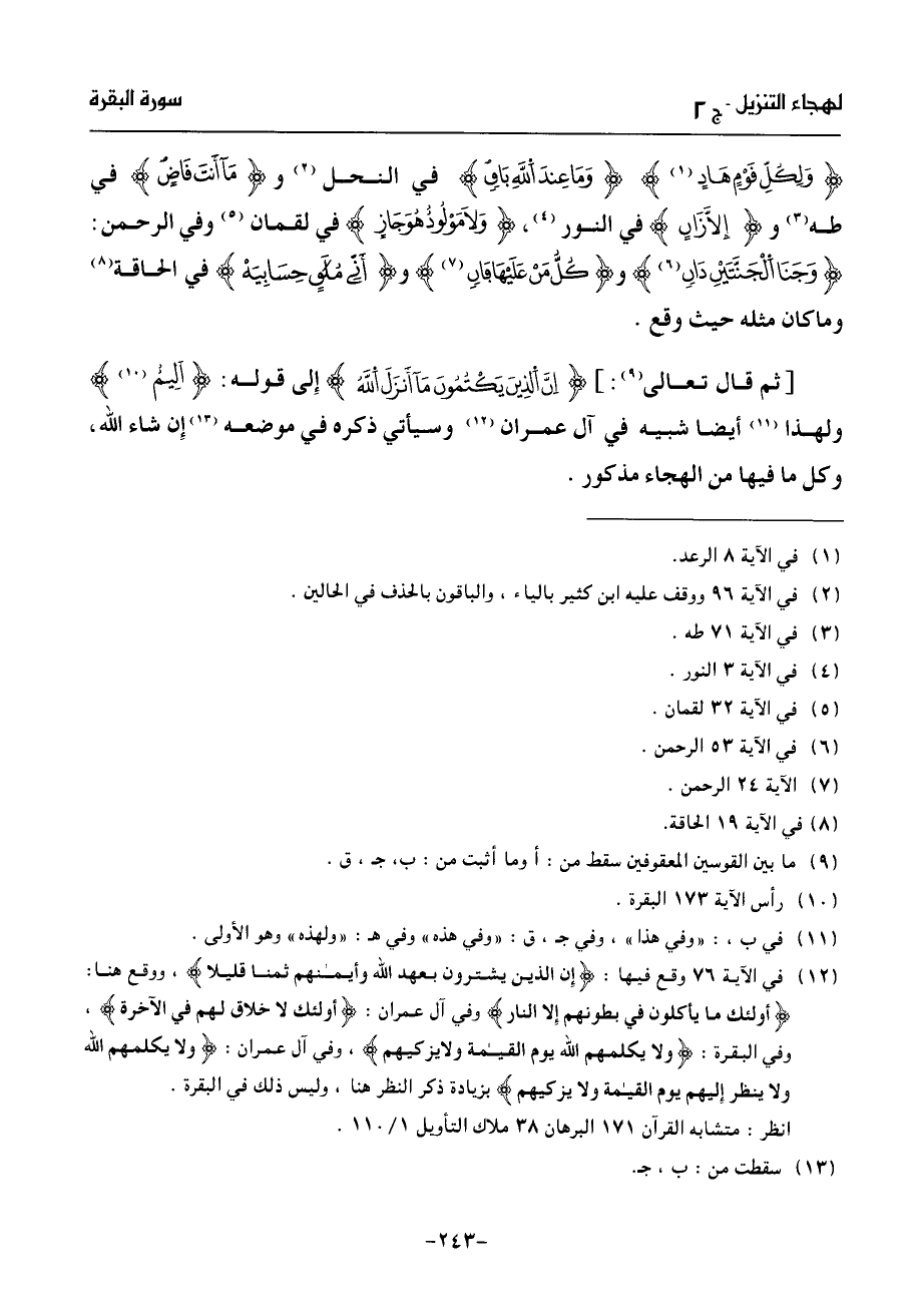 [ثم قال تعالى (¬9):] انّ الذين يكتمون ما أنزل الله إلى قوله: اليم (¬10) ولهذا (¬11) أيضا شبيه في آل عمران (¬12) وسيأتي ذكره في موضعه (¬13) إن شاء الله، وكل ما فيها من الهجاء مذكور.