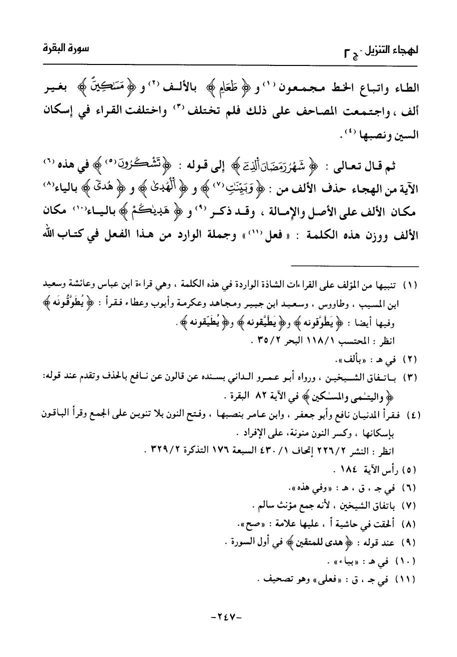 ثم قال تعالى: شهر رمضان الذى إلى قوله: تشكرون (¬5) في هذه (¬6) الآية من الهجاء حذف الألف من: وبيّنت (¬7) والهدى وهدى بالياء (¬8) مكان الألف على الأصل والإمالة، وقد ذكر (¬9) وهديكم بالياء (¬10) مكان الألف ووزن هذه الكلمة: «فعل (¬11)» وجملة الوارد من هذا الفعل في كتاب الله