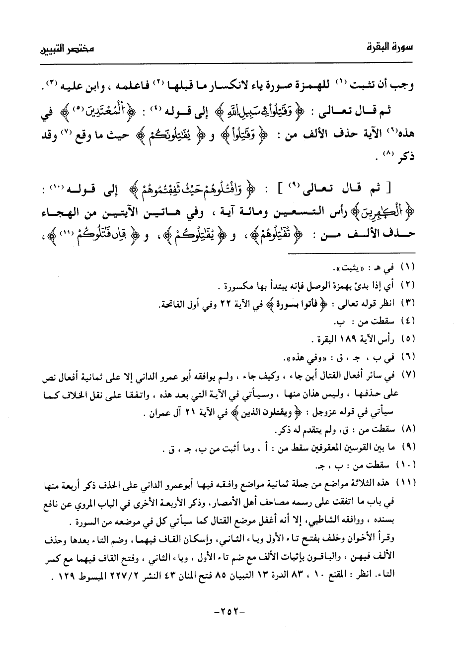 (¬7) في سائر أفعال القتال أين جاء، وكيف جاء، ولم يوافقه أبو عمرو الداني إلا على ثمانية أفعال نص على حذفها، وليس هذان منها، وسيأتي في الآية التي بعد هذه، واتفقا على نقل الخلاف كما سيأتي في قوله عز وجل: ويقتلون الذين في الآية 21 آل عمران.