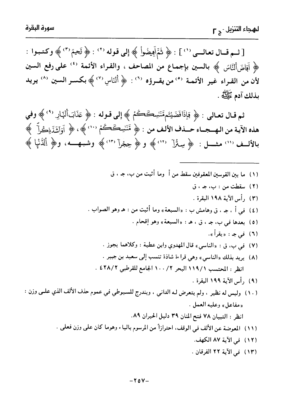 ثم قال تعالى: فإذا قضيتم مّنسككم إلى قوله: عذاب النّار (¬9) وفي هذه الآية من الهجاء حذف الألف من: مّنسككم (¬10)، أو اشدّ ذكرا بالألف (¬11) مثل: سترا (¬12) وحجرا (¬13) وشبهه، والدّنيا