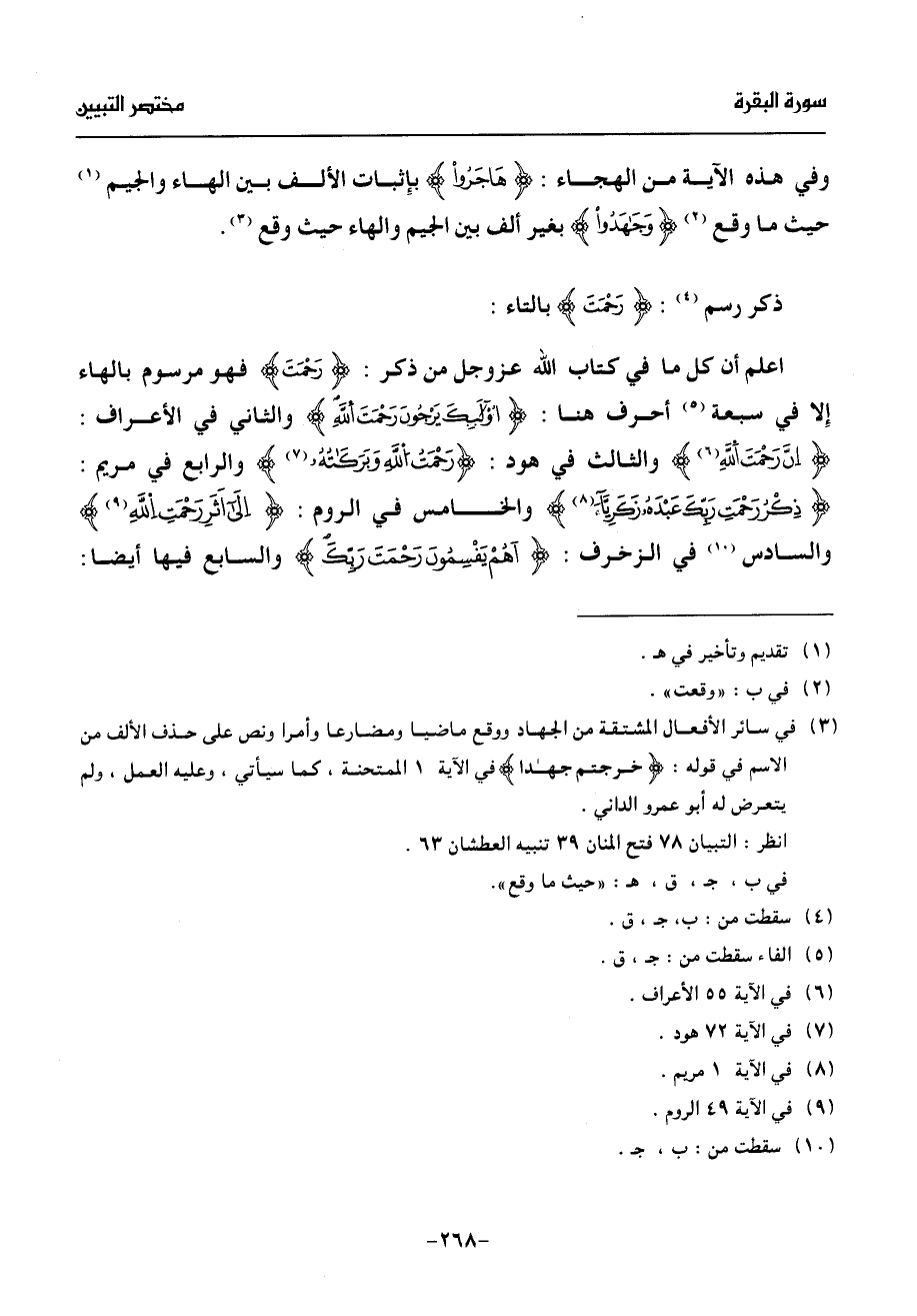 (¬3) في سائر الأفعال المشتقة من الجهاد ووقع ماضيا ومضارعا وأمرا ونص على حذف الألف من الاسم في قوله: خرجتم جهدا في الآية 1 الممتحنة، كما سيأتي، وعليه العمل، ولم يتعرض له أبو عمرو الداني.