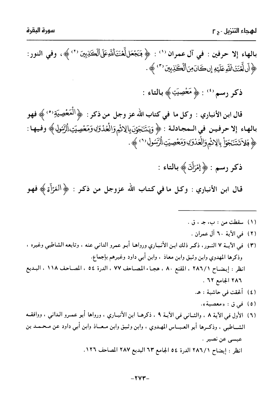 (¬3) في الآية 7 النور، ذكر ذلك ابن الأنباري ورواها أبو عمرو الداني عنه، وتابعه الشاطبي وغيره، وذكرها المهدوي وابن وثيق معاذ، وابن أبي داود وغيرهم بإجماع.