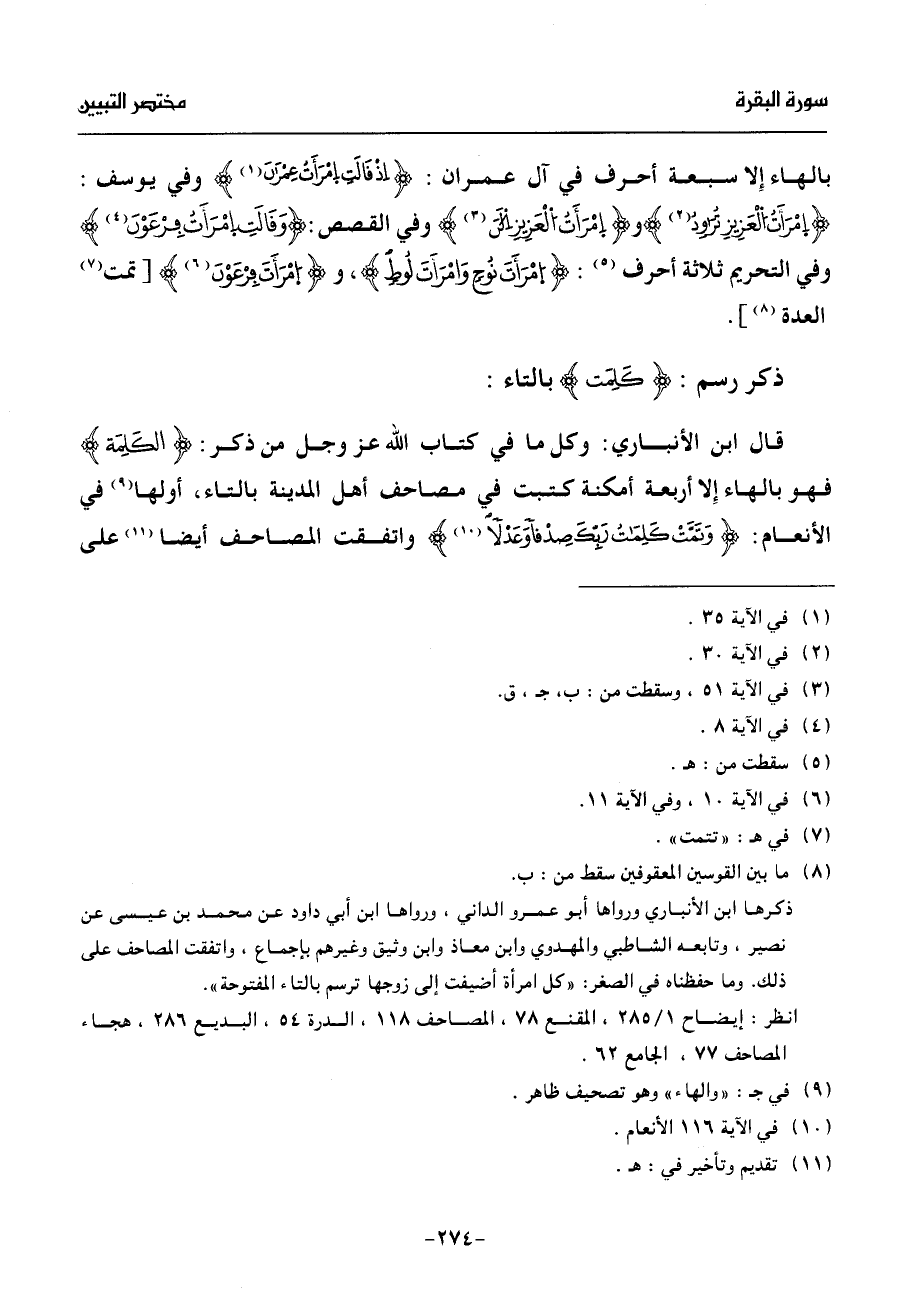 قال ابن الأنباري: وكل ما في كتاب الله عز وجل من ذكر: الكلمة فهو بالهاء إلا أربعة أمكنة كتبت في مصاحف أهل المدينة بالتاء، أولها (¬9) في الأنعام: وتمّت كلمت ربّك صدقا وعدلا (¬10) واتفقت المصاحف أيضا (¬11) على