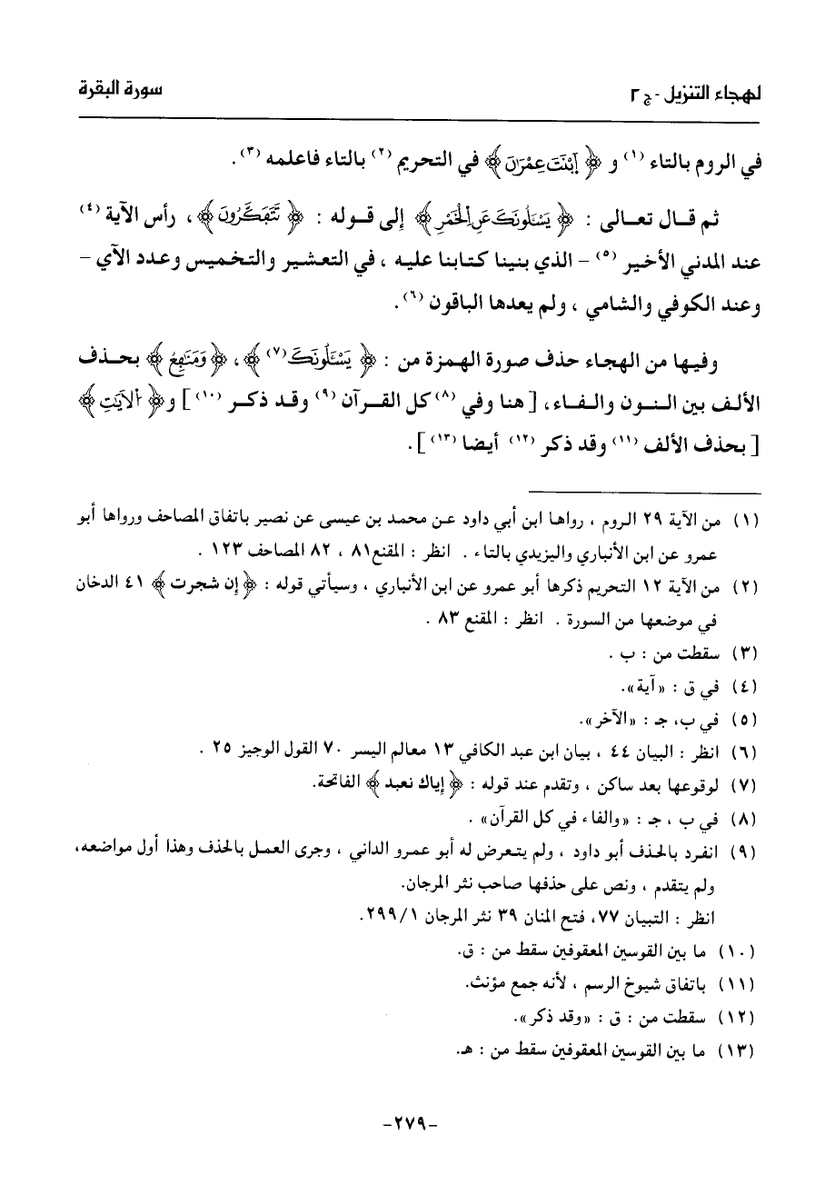 وفيها من الهجاء حذف صورة الهمزة من: يسئلونك (¬7)، ومنفع بحذف الألف بين النون والفاء، [هنا وفي (¬8) كل القرآن (¬9) وقد ذكر (¬10)] والايت [بحذف الألف (¬11) وقد ذكر (¬12) أيضا (¬13)].